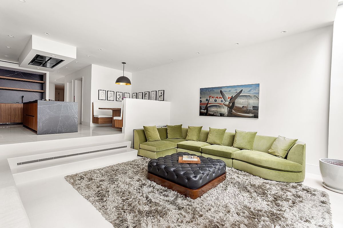 This contemporary living room showcases a spacious and inviting layout, ideal for family gatherings. The standout feature is a large, plush green sectional sofa, offering both comfort and style. A modern black tufted coffee table adds an elegant touch, harmonizing with the room’s neutral tones. The light-colored shag rug underfoot enhances warmth while the soft, white walls create an open feel. Sleek cabinetry and a dark kitchen island provide functional beauty, while framed artwork adds personality. Ample natural light flows in, accentuating the stylish, minimalist decor that balances family-friendly functionality with chic sophistication.