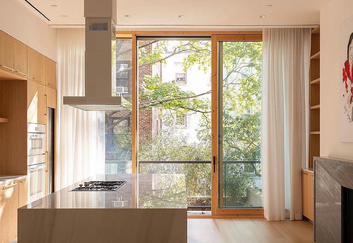 A sunlit modern kitchen features a spacious island topped with elegant marble, offering a perfect spot for meal preparation or casual dining. The cabinetry, crafted from warm wood, complements the airy feel of the space. Large floor-to-ceiling windows draped in sheer white curtains invite natural light while framing serene views of lush greenery outside. A minimalist hood vent hovers above a sleek gas cooktop, highlighting a blend of contemporary appliances. The palette embraces soft neutrals, enhancing the inviting atmosphere ideal for family gatherings and culinary creativity. Functional yet stylish, this kitchen exemplifies modern living.