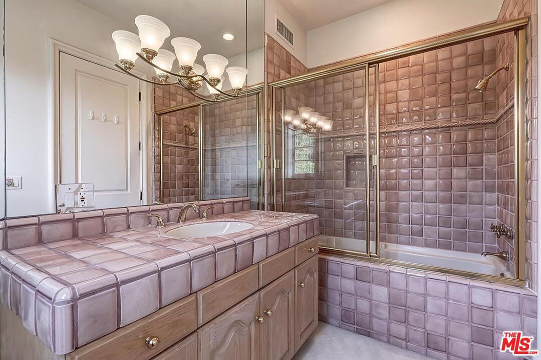 This bathroom blends retro charm with family-friendly convenience, featuring pastel lavender ceramic tiles that cover the vanity, countertop, and surrounding the bathtub. The warm hues of the tiles are complemented by brass fixtures and hardware, adding elegance and timeless appeal. A large mirror enhances the sense of space, while ample lighting provided by stylish sconces ensures the room feels inviting and bright. The built-in bathtub with sliding glass doors offers easy access, making it practical for families with children. Wooden cabinetry beneath the countertop provides generous storage for towels and essentials, combining function and sophistication in one cohesive design.