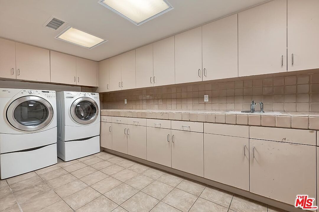 A generous laundry room is designed for both efficiency and comfort, offering ample workspace with extensive cabinetry and countertops in soft beige tones. The tile floors and matching tiled backsplash create a unified, easy-to-clean surface ideal for busy households. Modern, front-loading washer and dryer units stand side by side, making laundry day simple and accessible for any family size. Upper storage cabinets line the wall, providing organized space for supplies, while a utility sink adds functionality for delicate items or quick cleanups. Neutral lighting and a streamlined layout contribute to a bright, organized atmosphere that enhances everyday practicality.