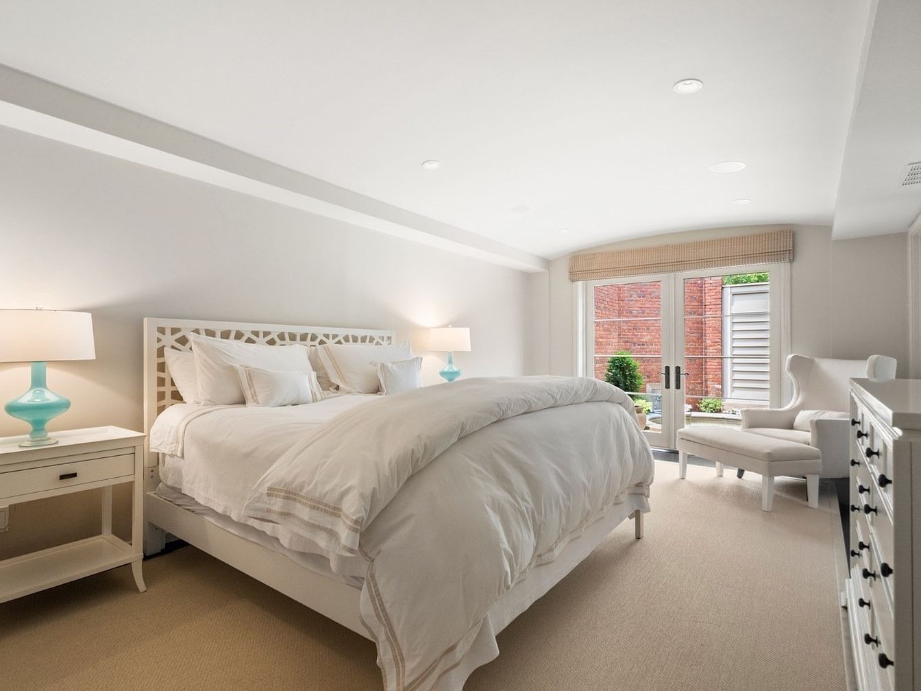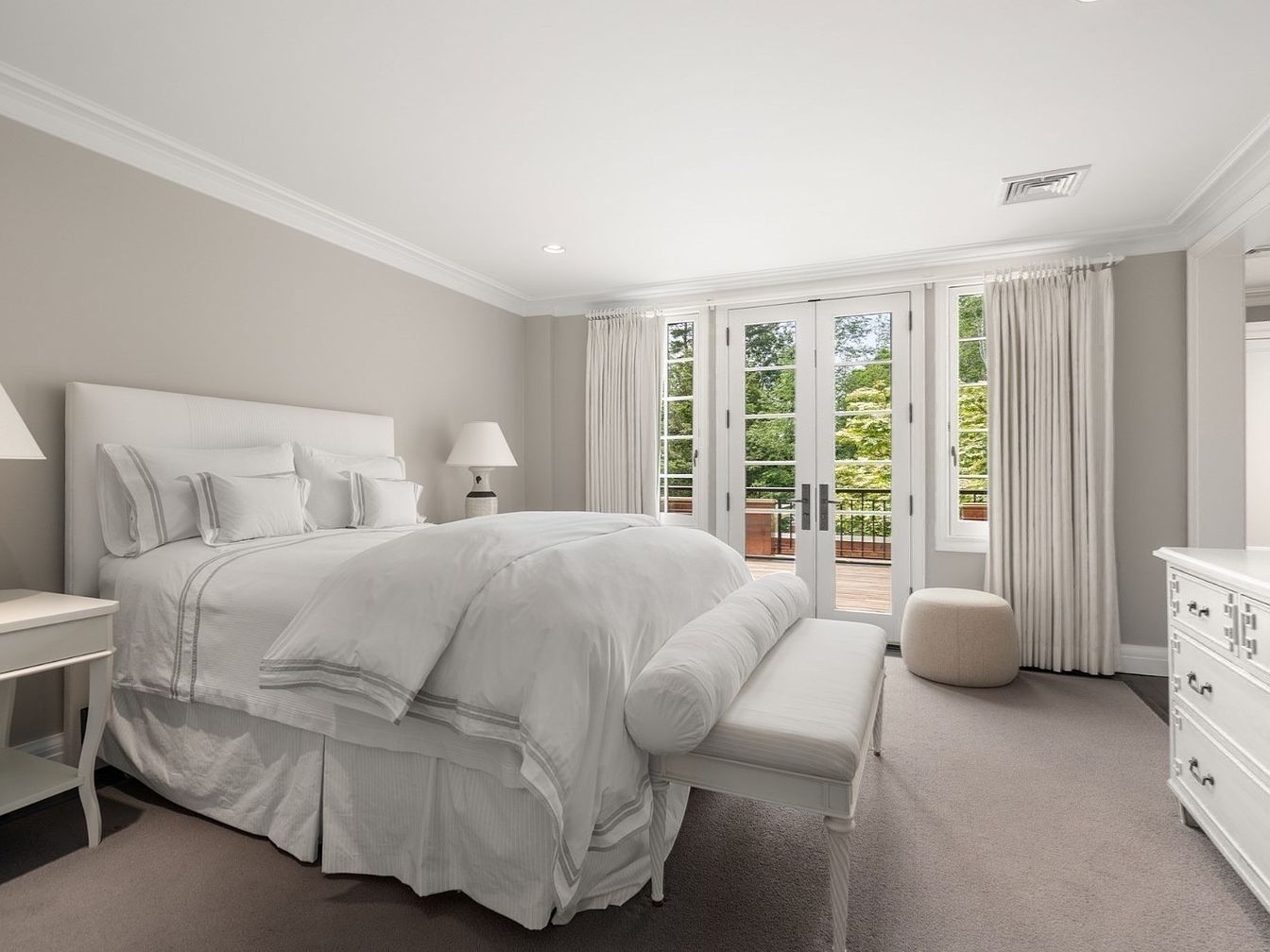 Serene and inviting, this master bedroom features a palette of soft neutrals with crisp white bedding, plush carpeting, and gentle off-white walls. A set of French doors floods the room with natural light and provides direct access to a garden-view balcony, creating a seamless connection between indoor comfort and outdoor serenity. The room boasts a spacious layout with a large, comfortable bed, classic bedside tables, and elegant lamps for ambient lighting. Thoughtfully chosen furnishings like a tufted bench and a cozy pouf add family-friendly elements for relaxation, while the uncluttered design ensures a peaceful environment perfect for unwinding.