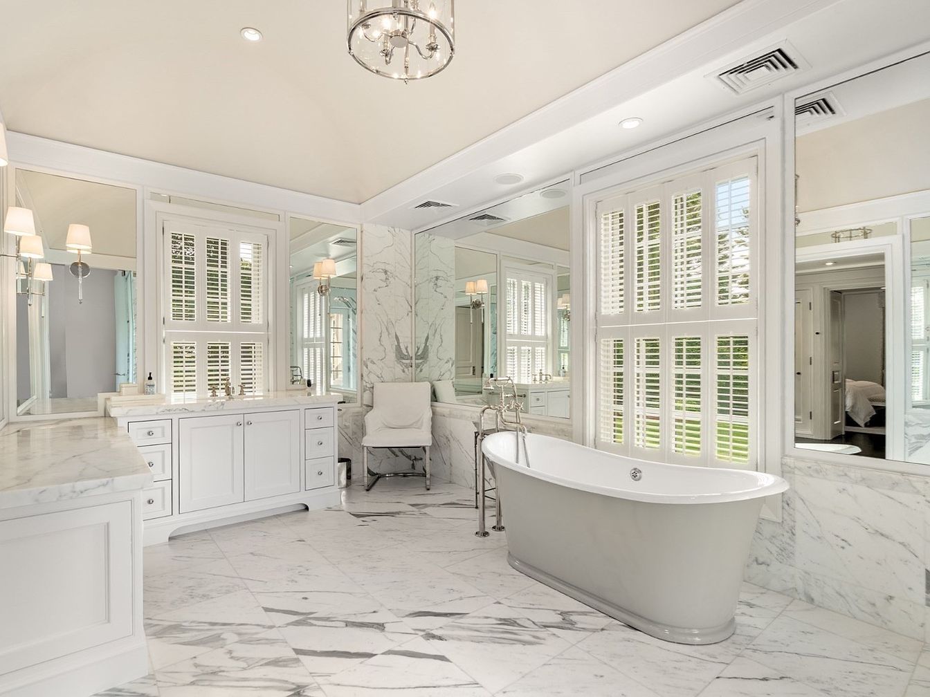Spacious and airy, this master bathroom impresses with a luxurious freestanding soaking tub as its centerpiece, surrounded by elegant marble flooring and marble-accented walls. Dual vanities flank the space, adorned with white cabinetry and expansive mirrors that reflect natural light pouring in from tall windows fitted with plantation shutters. Subtle touches of chrome and glass in the lighting and fixtures add contemporary sparkle, while plush seating by the tub offers comfort and convenience for family routines. The serene white and grey palette, combined with classic architectural detailing, creates a tranquil oasis perfect for family living and relaxation.