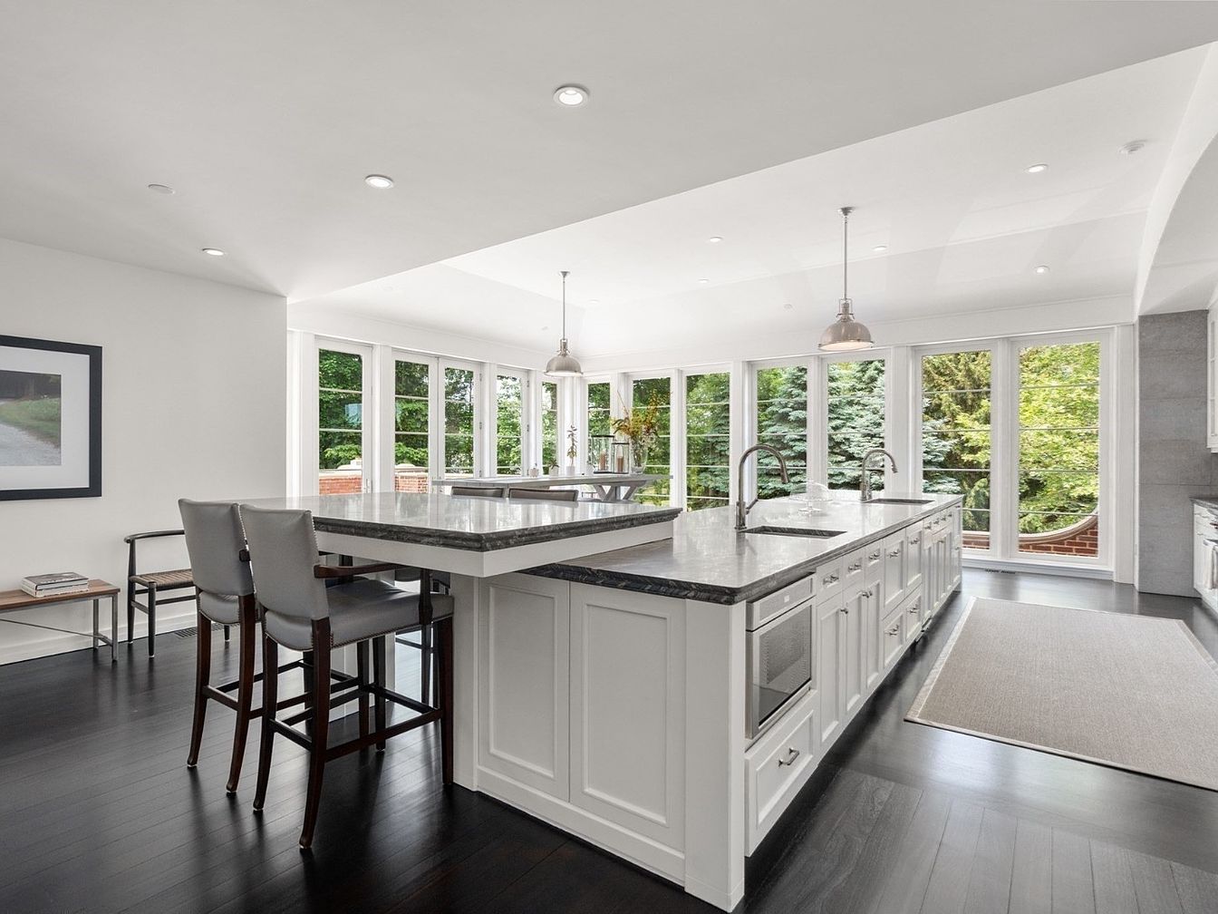 A spacious kitchen showcases a stunning central island with a sleek, dark-stone countertop and ample seating, perfect for family gatherings or casual dining. The open layout seamlessly connects to a dining area highlighted by panoramic floor-to-ceiling windows, bathing the space in natural light while offering lush garden views. Crisp white cabinetry, stainless steel fixtures, and modern pendant lighting add elegance, while dark wood floors provide striking contrast. Family-friendly elements include wide walkways, multiple sinks, and built-in appliances, making meal prep easy and ensuring plenty of room for shared activities in a bright, inviting atmosphere.