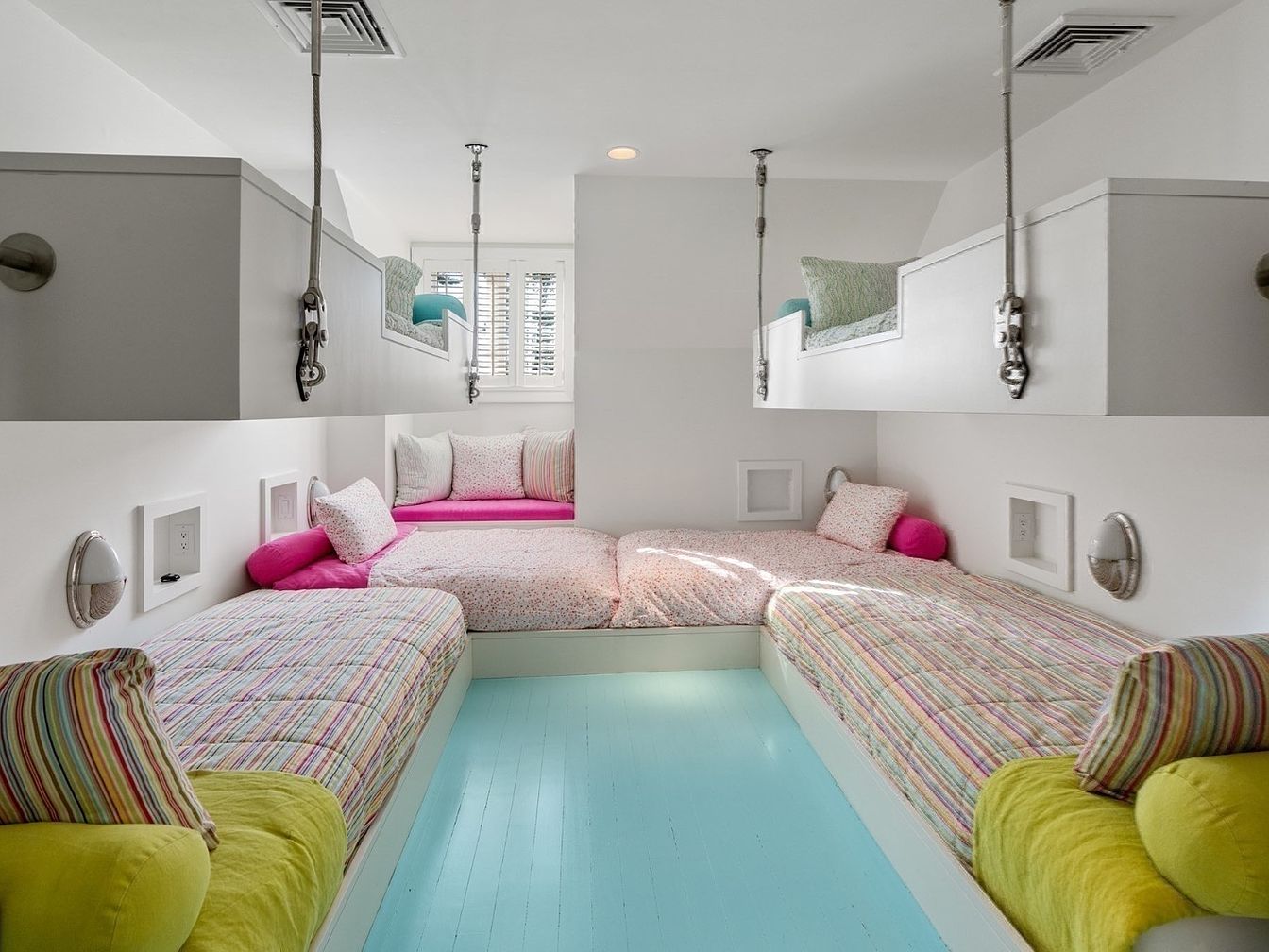 A bright, inviting kid’s bunk room features built-in twin beds with vivid striped and pastel bedding, creating a playful, cozy retreat. The layout maximizes space for families, offering four beds at ground level and two suspended bunks above, accessible by sturdy ropes and pulleys, perfect for siblings or sleepovers. Soft hues of aqua, pink, and lime green paired with crisp white walls lend a cheerful, clean vibe. Each bed is equipped with its own reading light and outlets built into the walls for convenience. Shuttered windows provide natural light, making this a lively, functional space ideal for children.