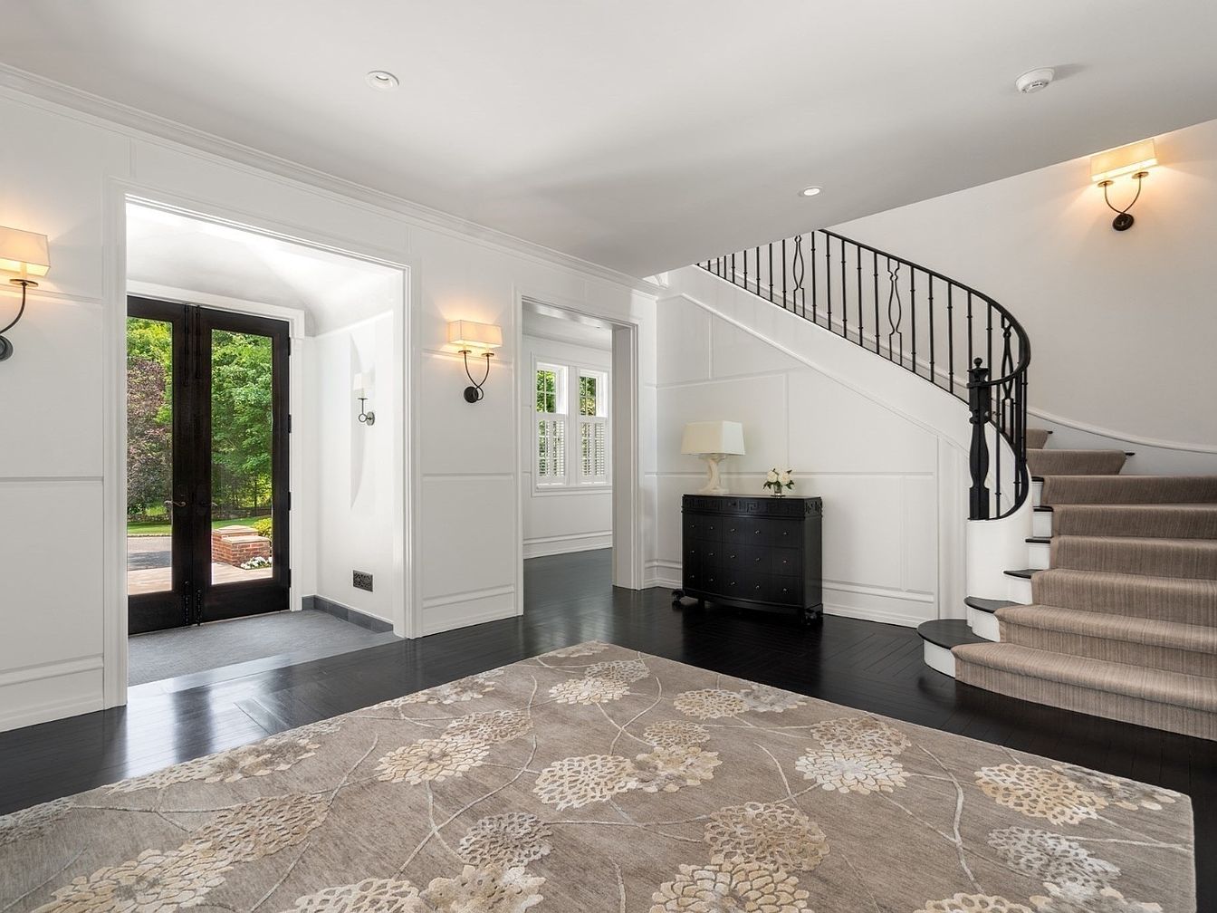 A spacious entryway accented by a sweeping staircase with wrought iron railings sets a sophisticated tone for the home. The area is bathed in natural light from double front doors with glass panes, creating a welcoming atmosphere. Walls painted crisp white highlight the elegant symmetry of the architectural details. The dark hardwood floors are balanced by a plush, patterned area rug with neutral tones that adds warmth and comfort, perfect for families. Subtle wall sconces provide soft ambient lighting, while a sleek black console table topped with a minimalist lamp and floral touch enhances the room’s refined yet approachable aesthetic.