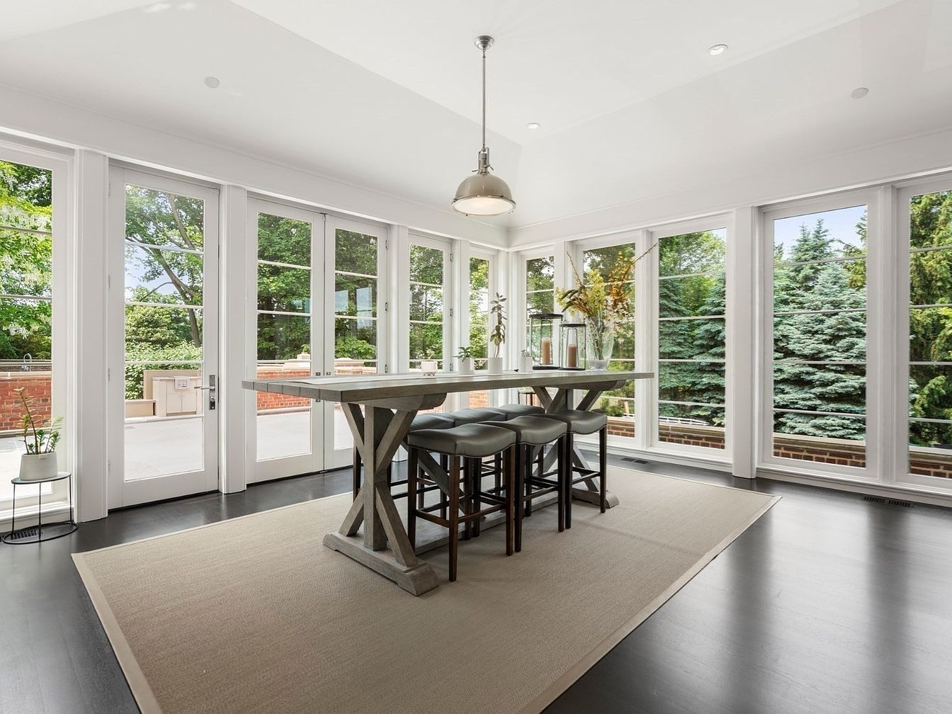 Bright and airy, this sunroom dining area is surrounded by large French doors and expansive windows, flooding the room with natural light and creating seamless indoor-outdoor flow. The rectangular farmhouse-style table and cushioned barstool chairs offer a perfect spot for family gatherings and casual meals. A neutral palette of whites and soft grays is complemented by the dark hardwood floors and a light area rug that anchors the space. Modern pendant lighting above the table adds a touch of industrial flair. Accents like fresh greenery and simple decor enhance the welcoming, family-friendly ambiance, making this a versatile and inviting space.