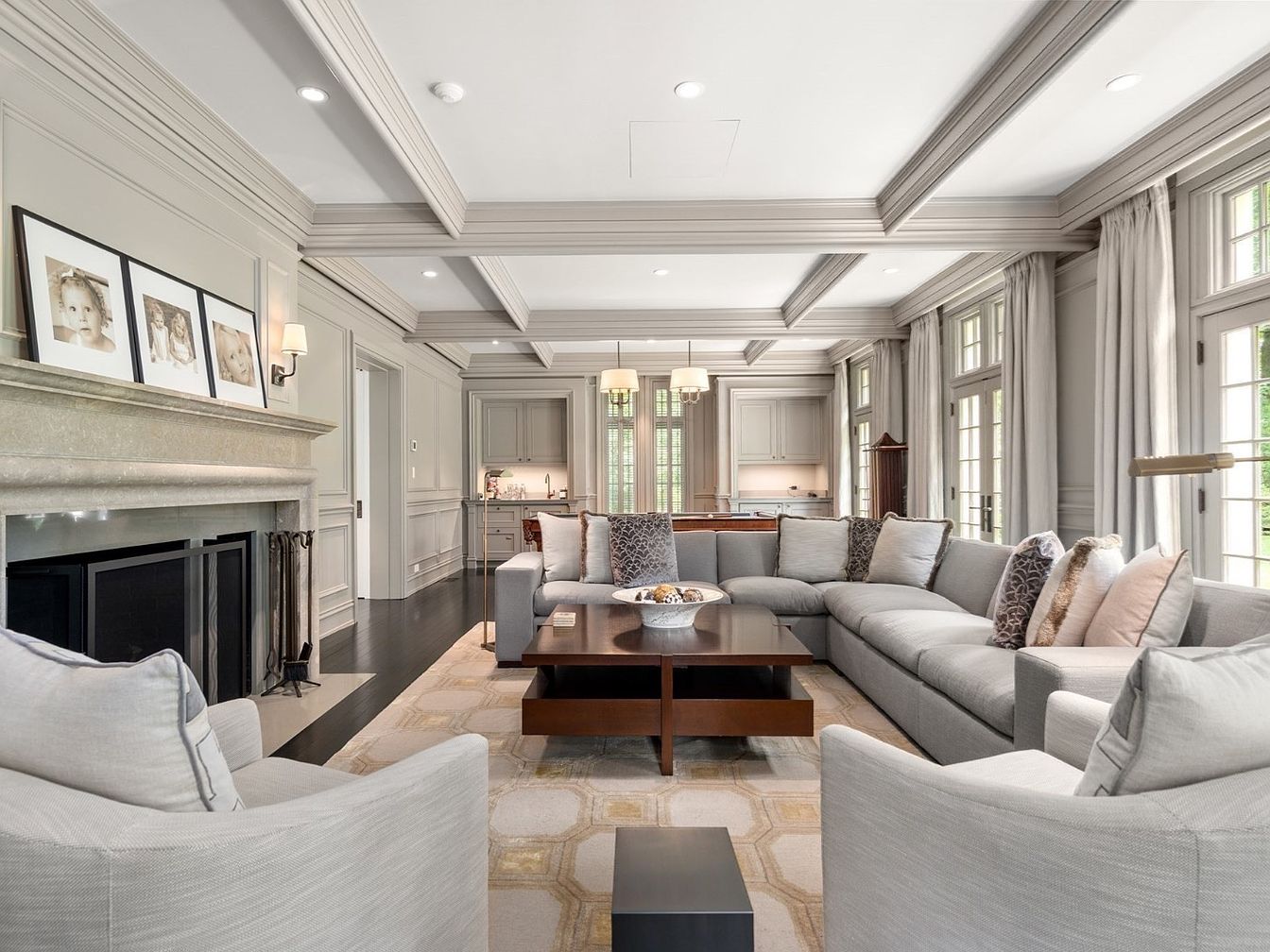 A stunning open-layout living room blends seamlessly into the kitchen, creating an ideal setting for family gatherings. A spacious L-shaped sectional in soft gray tones anchors the room, promoting comfort and conversation. The fireplace mantel, adorned with family photography, adds a personal and inviting touch, while the coffered ceiling and extensive moldings contribute classic architectural interest. Large windows framed by elegant drapes bring in ample natural light, enhancing the neutral color palette. The plush geometric area rug and modern wooden coffee table provide both style and functionality, making this a practical and welcoming space for all ages.