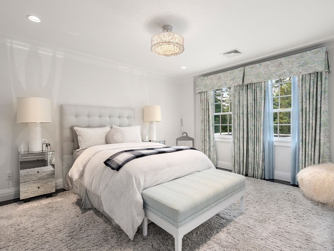 A serene bedroom designed with comfort and style in mind, featuring a tufted headboard and a plush white bedding ensemble. The soft gray carpet and gentle light from two elegant bedside lamps enhance the welcoming atmosphere. Mirrored nightstands add a touch of glamour, while the pastel-hued bench at the foot of the bed provides both function and charm. Large windows with patterned drapes bathe the room in natural light, making it a perfect space for relaxation. Calm neutral tones, luxurious textiles, and family-friendly furnishings create an inviting environment ideal for both parents and children.