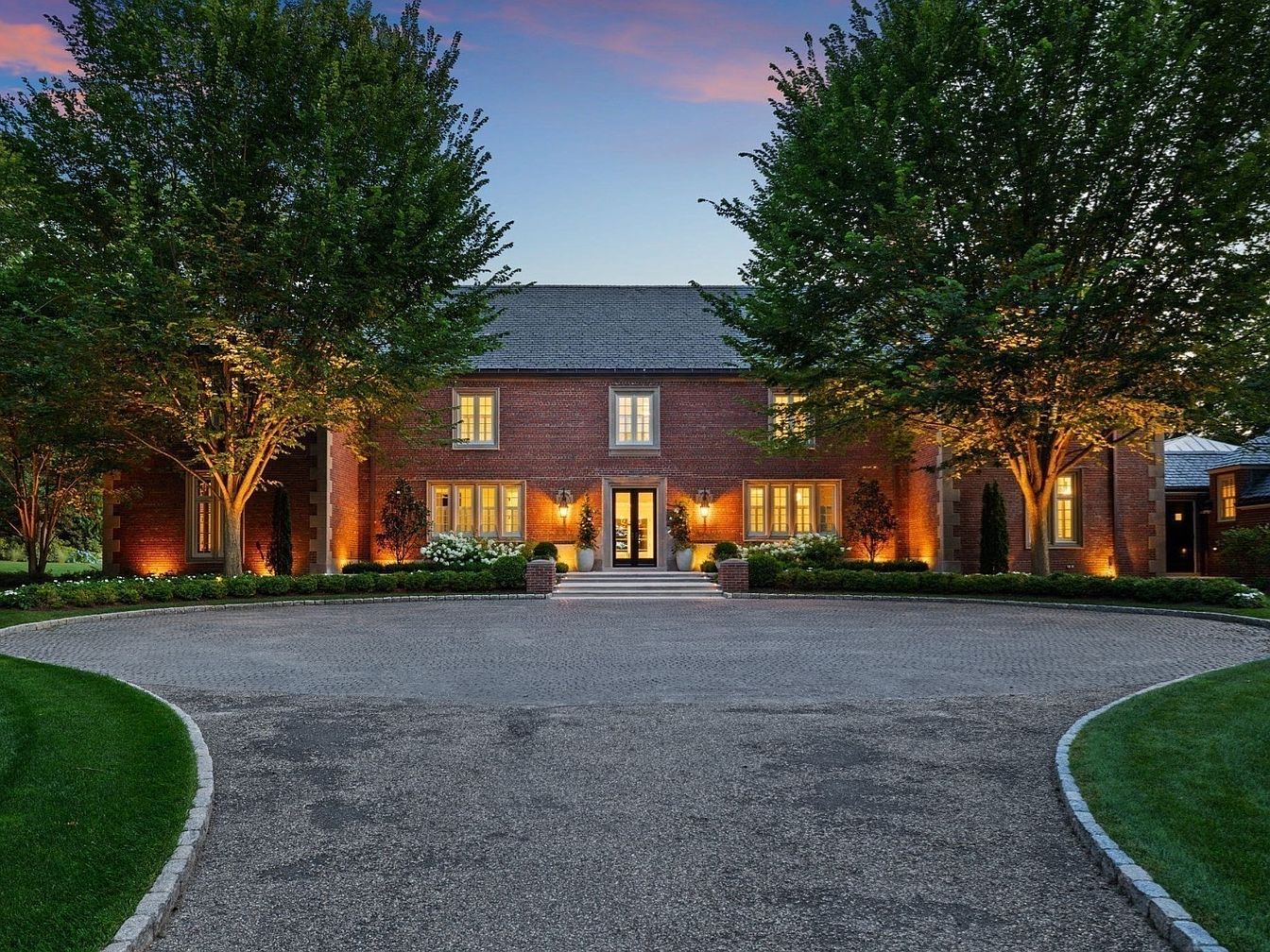 A grand brick façade welcomes visitors with stately symmetry and timeless elegance. Mature trees flank the sweeping circular driveway, offering ample space for cars and easy access for families. The warm glow from exterior lighting highlights meticulously landscaped gardens, trimmed hedges, and lush flower beds that soften the structured lines of the home. Large paned windows with cream trim create an inviting appearance, while the double-door entrance, framed by shrubbery and subtle steps, beckons guests. The classic red brick exterior and slate roof add a sense of durability and tradition, making this front entrance both impressive and family-friendly.