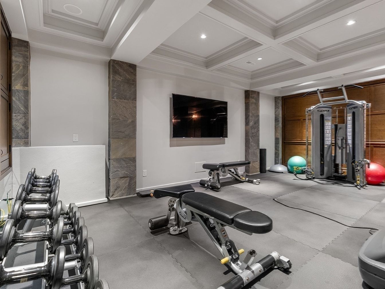 A spacious home gym outfitted for all fitness levels, featuring padded flooring for comfort and safety, ideal for adults and kids alike. The room is bright and inviting, illuminated by recessed lighting in the coffered ceiling and accented by textured stone pillars. A suite of equipment includes dumbbells, a multi-gym machine, an adjustable bench, and colorful exercise balls, offering versatile workout options. A streamlined wall-mounted TV provides entertainment or workout guidance. The neutral palette of gray and white, paired with natural wood and stone elements, creates a modern yet cozy atmosphere, perfectly blending function with family-friendly design.