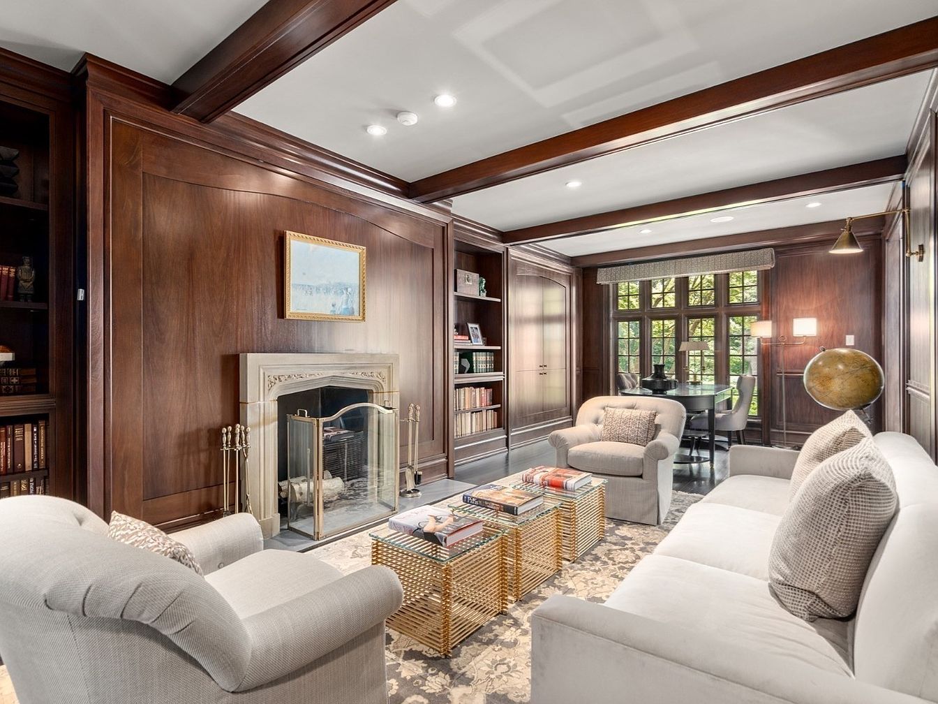 This sophisticated library lounge blends classic charm with modern comfort, highlighted by rich, dark wood-paneled walls and exposed ceiling beams that lend warmth to the space. Tall built-in bookshelves frame an elegant marble fireplace, creating a cozy backdrop for family gatherings and quiet reading sessions. Upholstered armchairs and a plush sofa cluster around a textured coffee table, perfect for board games or conversations. Soft neutral tones in the furniture and rug complement the natural light streaming through expansive windows, while a nearby table offers a spot for work or study. The refined atmosphere remains inviting and family friendly.