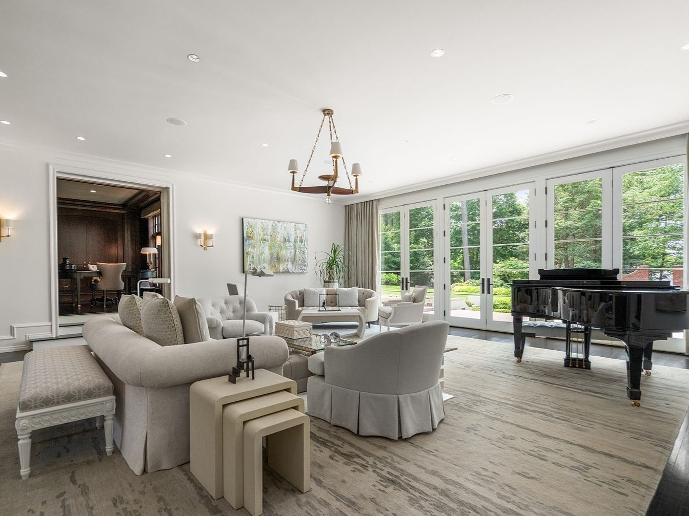 A spacious living room is designed with an open, airy layout that welcomes natural light through a long wall of floor-to-ceiling French doors overlooking a lush garden. Neutral tones of cream, beige, and soft gray create a calming atmosphere, enhanced by plush sofas and armchairs arranged for easy conversation. A striking black grand piano adds sophistication and a sense of family gathering space. Modern artwork and elegant sconces bring character to the white walls, while subtle metallic accents lend luxury. The room’s design encourages relaxation and togetherness, making it ideal for family activities and entertaining guests alike.