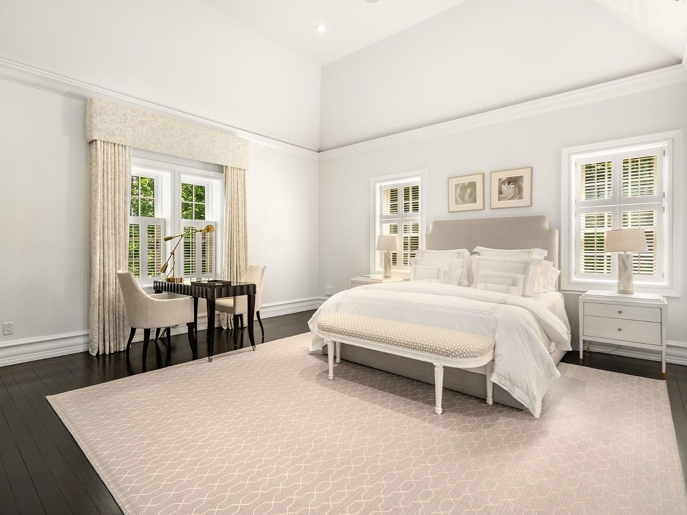 A serene and spacious primary bedroom features a calming neutral palette with soft whites and beiges, creating an inviting and restful ambiance. The large bed is adorned with plush, textured bedding and flanked by matching nightstands topped with contemporary lamps for soft, ambient lighting. Wide windows let in abundant natural light, highlighted by plantation shutters and elegant, floor-length drapes. A cozy sitting or study nook with tailored chairs and a sleek black desk provides a functional space for reading or working. The dark wood floors are balanced by a generous, patterned area rug, making the room both stylish and family-friendly.