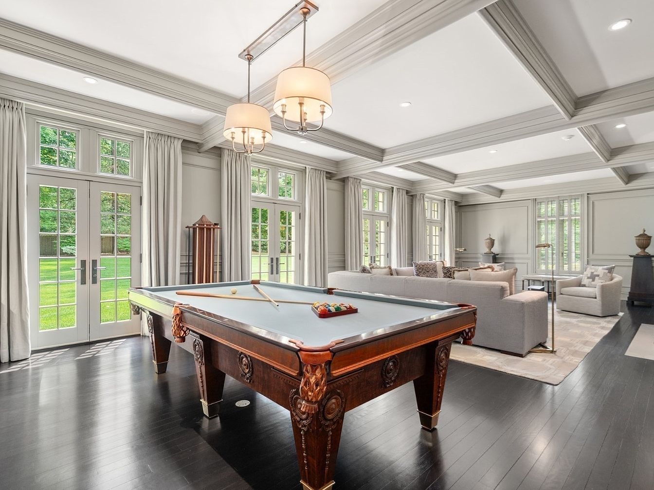 This spacious game room and lounge is designed for both relaxation and entertainment, featuring a classic pool table with ornate woodwork as its centerpiece. Large windows and multiple French doors flood the room with natural light while providing beautiful views of the expansive green lawn. Plush, neutral-toned sofas create a cozy seating area perfect for family gatherings or hosting friends. The elegant coffered ceiling, muted gray trim, and soft drapery add sophistication, while the dark wood floors contrast beautifully with the light décor. Ample seating and open layout make this an inviting, family-friendly space for fun and connection.