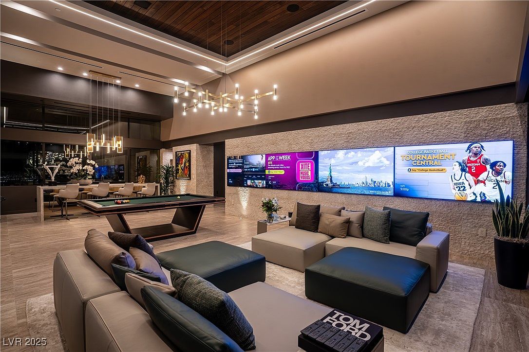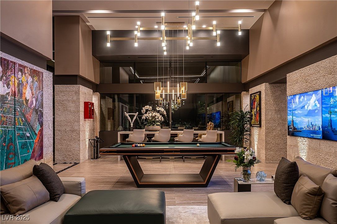 An open-concept entertainment lounge exudes modern sophistication with high ceilings and expansive glass windows. The centerpiece is a sleek billiards table, surrounded by plush sectional sofas ideal for gatherings. Soft, earthy tones complement textured stone walls, while artistic wall decor and vibrant paintings add personality to the space. A contemporary chandelier provides ambient lighting, and mounted flat screens make this room perfect for family movie nights or watching sports. The dining area in the background features modern chairs and elegant floral arrangements, creating a seamless transition between relaxation and entertainment zones. Indoor plants and thoughtful accents offer warmth and livability.
