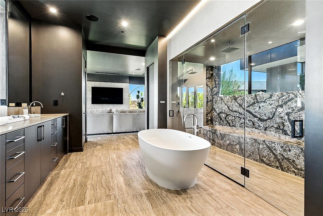 A luxurious and open master bathroom features a freestanding oval soaking tub set on elegant marble floors, complemented by a glass-enclosed walk-in shower with dramatic stone accent walls. Wide vanity cabinetry provides ample storage, making it ideal for families. Soft, natural lighting floods the space through expansive windows, creating a serene spa-like ambiance. The color palette is a blend of earthy beige and sophisticated charcoal, while clean lines and modern fixtures add a contemporary touch. Just beyond, the bathroom transitions seamlessly into a cozy lounge area, ideal for relaxing or gathering with loved ones, enhancing the suite’s family-friendly appeal.