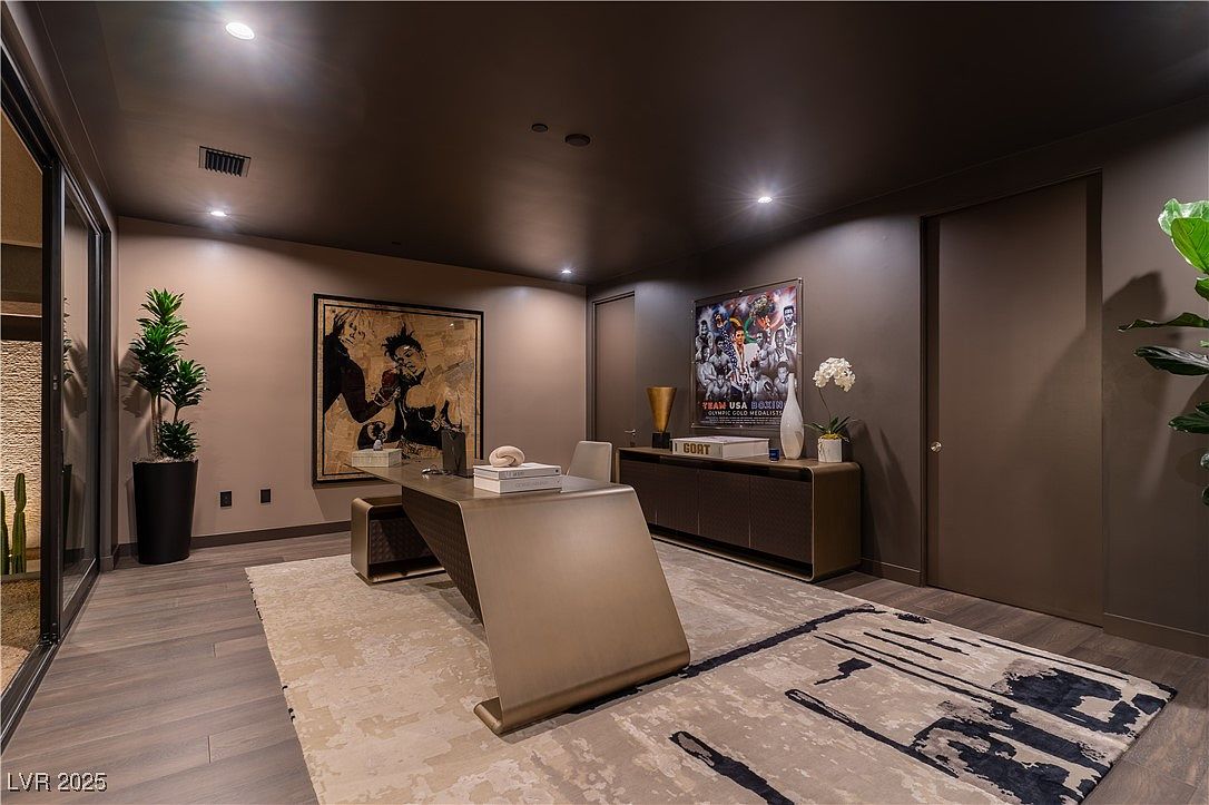 Modern sophistication defines this home office, featuring a streamlined metallic desk set atop a large, abstract-patterned rug. Neutral brown tones envelop the walls, ceiling, and furniture, creating a warm, immersive atmosphere perfect for focus and creativity. Artistic touches, including two bold framed artworks, add character and inspiration, while large, leafy plants in sleek planters bring a fresh vibrancy and life to the space. Natural light filters through glass doors, making it an inviting area for work or study. Family-friendly functionality is evident in the ample storage, uncluttered surfaces, and an environment suited for productivity and quiet reflection.