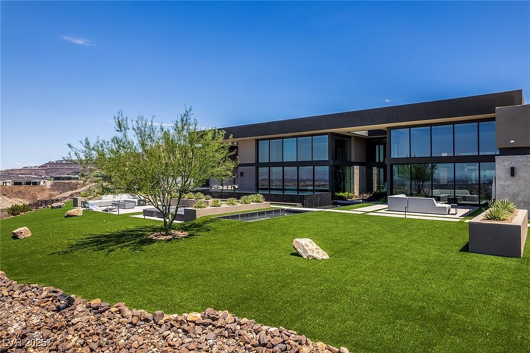 A serene modern backyard features a spacious artificial lawn, perfect for family play and gatherings, accented by desert-adapted landscaping and sculptural rocks. The house showcases clean architectural lines and extensive floor-to-ceiling glass windows, merging interior comfort with outdoor beauty. Sleek outdoor lounge areas invite relaxation, while minimalistic planters filled with hardy vegetation line the patio edges. The color palette highlights natural greens and earth tones, balanced by dark window framing and neutral-hued exterior walls. The open, uncluttered layout encourages outdoor activities for children and adults alike, making it both stylish and family-friendly for entertaining or unwinding.