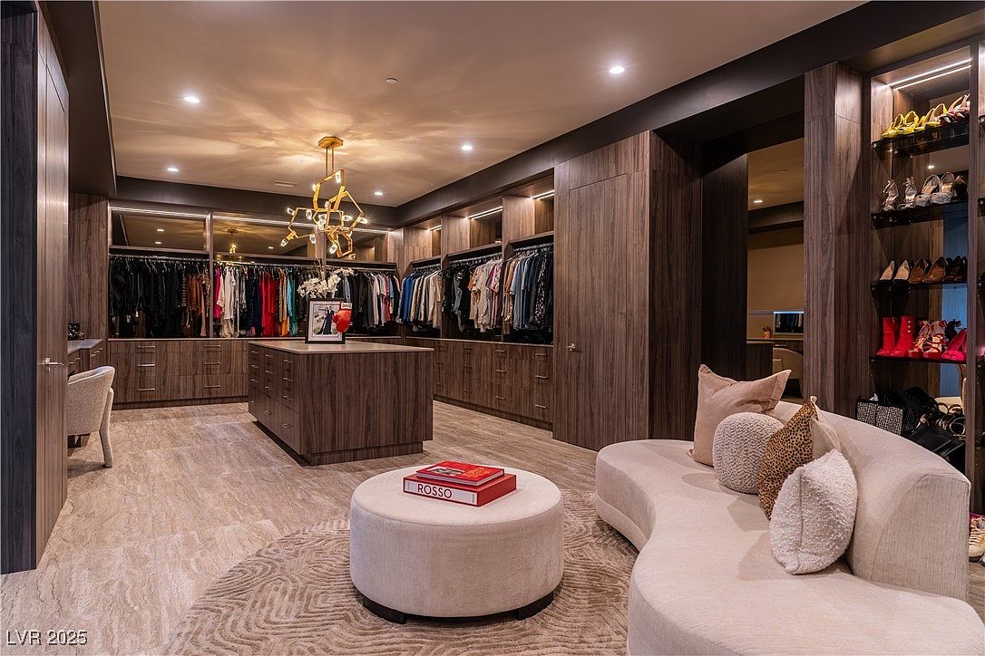 This luxurious walk-in closet features rich, wood-paneled cabinetry lining the walls, ample built-in drawers, and dedicated spaces for organizing both clothing and accessories. A spacious island provides extra storage and a surface for displaying decorative elements. The sitting area includes a modern curved sofa and round ottoman, perfect for relaxing or family members assisting with wardrobe choices. Soft neutral hues and warm lighting from a striking gold chandelier create a welcoming ambiance, while the plush patterned rug adds tactile comfort. Open shelving for shoes, thoughtful layout, and expansive mirrors enhance both style and everyday functionality, making this closet both practical and sophisticated.