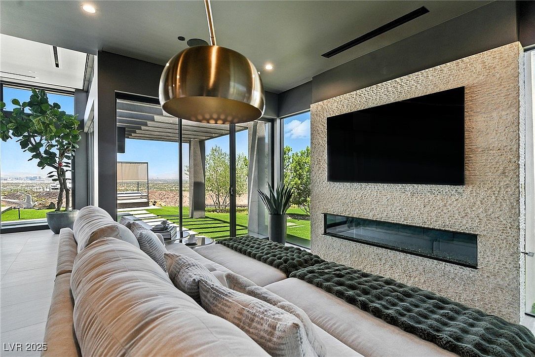 A striking modern living room seamlessly connects to the outdoors with expansive floor-to-ceiling windows, flooding the space with natural light and offering panoramic views of the landscaped yard. The plush, oversized sectional invites family lounging, while a cozy textured throw softens the contemporary lines. The room is anchored by a dramatic stone accent wall housing a sleek fireplace and mounted TV, complemented by warm metallic lighting. Subtle gray finishes and minimalist décor are counterbalanced by the vibrant greenery both inside and outside, creating an inviting environment ideal for family gatherings and effortless indoor-outdoor entertaining.