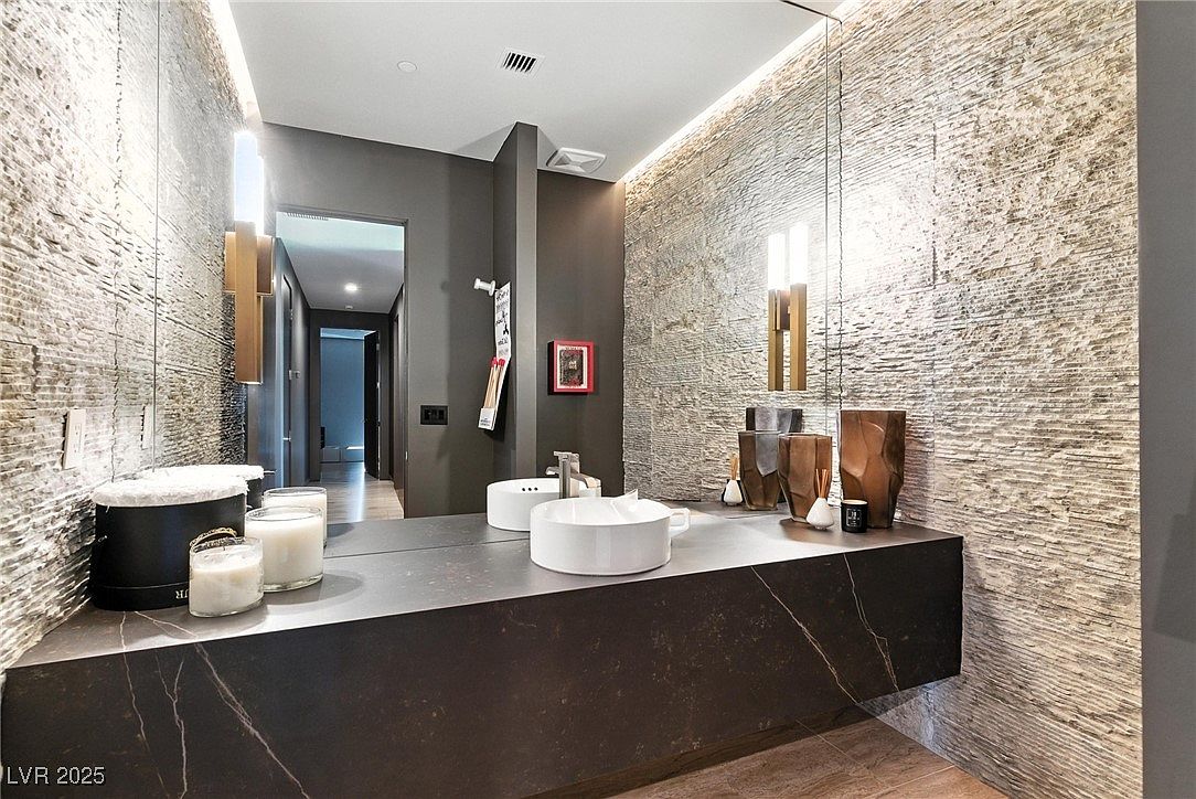 A striking bathroom vanity combines modern luxury with functionality, featuring a dramatic stone countertop and vessel sink as the centerpiece. The textured stone wall adds depth and tactile interest, complemented by sleek, matte gray walls for a sophisticated ambiance. Warm, linear light fixtures flank the large mirror, enhancing the space with soft, inviting illumination. Minimalist decor includes tasteful candles and storage accessories in neutral tones, making the area both stylish and inviting for families. The spacious vanity surface offers ample room for daily essentials, while the hallway view connects seamlessly to the rest of the home, ensuring easy access for all family members.