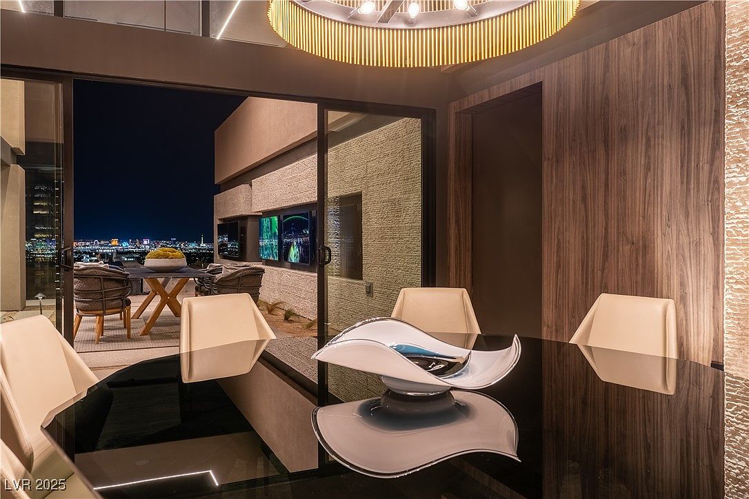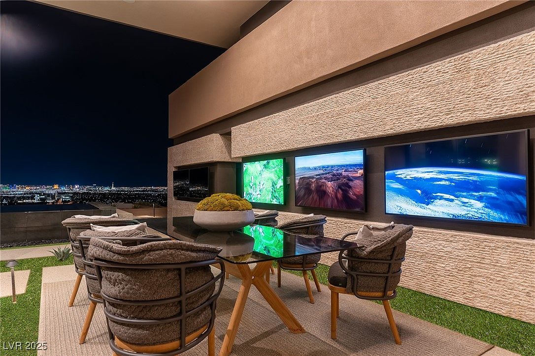 A spacious outdoor terrace designed for modern living, featuring a glass dining table surrounded by plush, cushioned chairs ideal for family gatherings or casual dinners. Multiple wall-mounted screens create a dynamic multimedia experience, perfect for entertaining both guests and children. The neutral color palette, with textured stone walls and warm wooden accents, brings a calming yet sophisticated atmosphere. The area seamlessly blends indoor luxury with the breathtaking city skyline as a backdrop. Thoughtful design elements such as soft area rugs and integrated planters add comfort and warmth, making the space inviting for all ages and perfect for evening relaxation.
