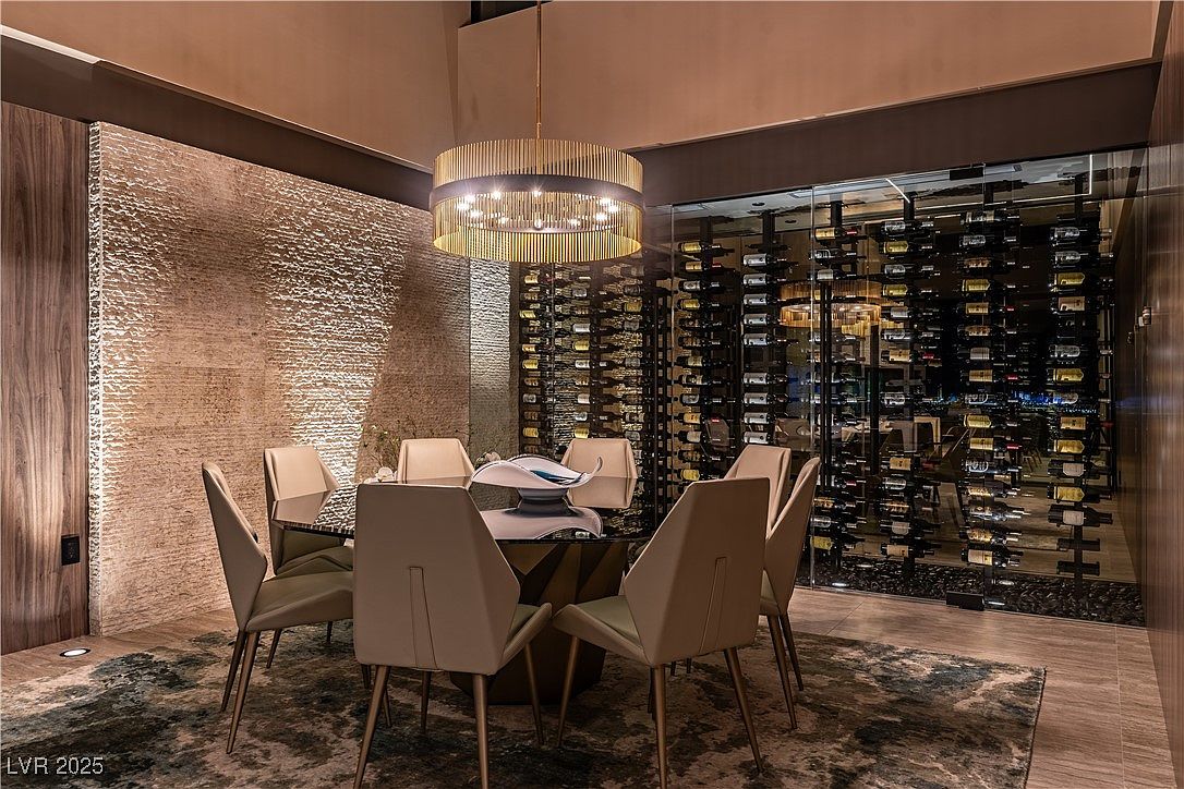 A stunning dining area exudes luxury and contemporary elegance. The centerpiece is a sleek glass-topped table surrounded by eight modern cream-colored chairs with angled legs, creating a comfortable yet stylish setting for family gatherings or entertaining guests. On one side, a dramatic textured wall adds depth and warmth, softly illuminated to highlight its detail. On the opposite side, a floor-to-ceiling glass wine cellar displays an extensive collection, doubling as a sophisticated design feature. The soft, neutral color palette and plush area rug foster a welcoming atmosphere, while a striking chandelier overhead bathes the room in golden light.