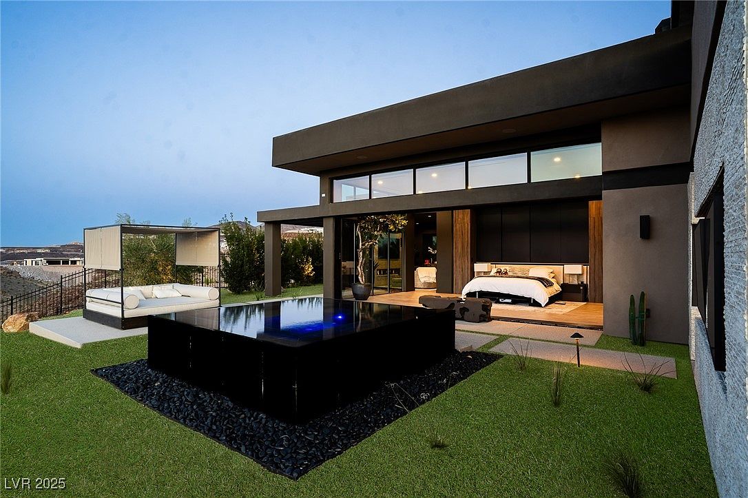 A stunning modern patio extends seamlessly from the home’s expansive living spaces, framed by dramatic floor-to-ceiling windows that bathe the interior in natural light. The design features sharp architectural lines, a floating black water feature, and a sleek, illuminated pool, creating a tranquil oasis perfect for family gatherings. The minimalist landscaping combines manicured grass strips with textured stone pathways and ornamental grasses, offering ample room for kids to play. Warm LED lighting accents the geometric overhangs, enhancing the sophisticated yet inviting atmosphere. This outdoor retreat blends elegance, safety, and comfort, encouraging relaxation and entertainment for all ages.