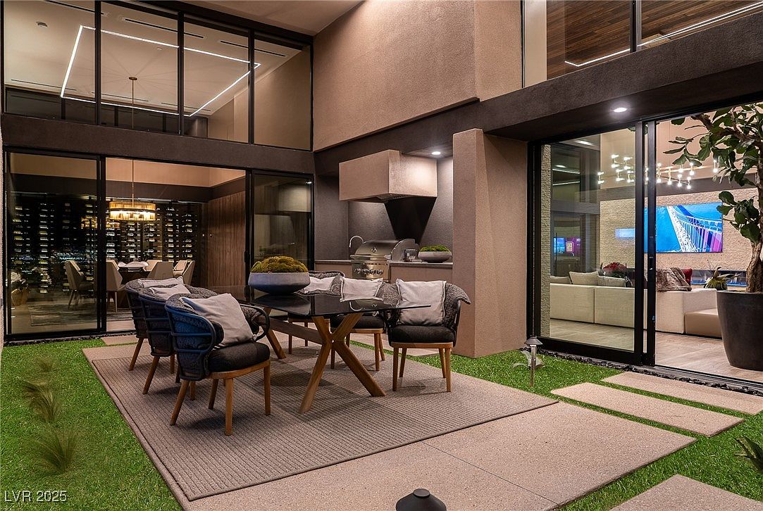 Sophisticated and welcoming, this outdoor dining patio seamlessly blends with the surrounding indoor spaces through expansive glass doors, encouraging family gatherings and entertaining guests. The open-air kitchen features a built-in grill shaded by a modern angular hood, perfect for alfresco meals. The contemporary dining table is complemented by plush, stylish chairs and cozy throw blankets, inviting relaxation and conversation. Soft turf and large concrete pavers offer a clean, safe surface for children to play. The neutral palette of taupe, charcoal, and beige echoes throughout, enhanced by ambient lighting and lush green accents for an inviting, modern oasis.