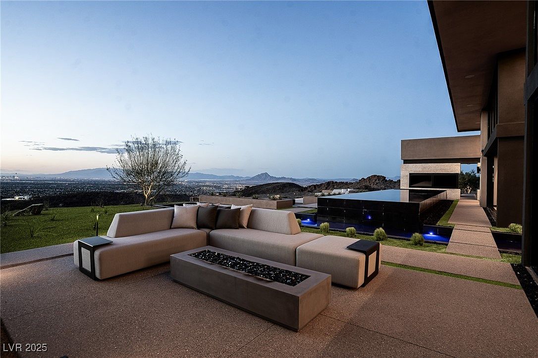 A spacious modern patio features a sleek sectional sofa arranged around a contemporary fire pit, offering plenty of comfortable seating for gatherings. The neutral color palette of soft grays and beiges blends seamlessly with the surrounding landscape and the geometric lines of the home’s architecture. An infinity-edge pool adds a touch of luxury and reflects the breathtaking mountain and city views in the distance. Clean architectural lines and minimalist detailing create a stylish yet family-friendly space, making it perfect for both relaxation and entertaining, while the open layout allows everyone to enjoy the panoramic outdoor setting together.