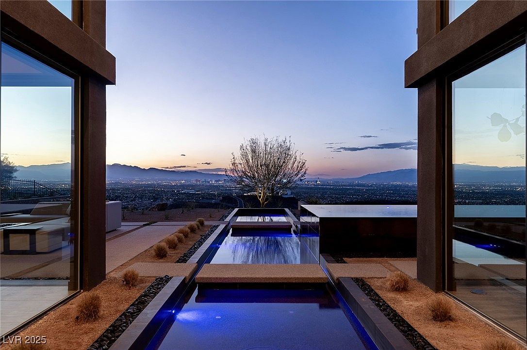 Modern lines and expansive glass frame a stunning patio that merges seamlessly with an elevated pool. The tranquil water feature is highlighted by subtle blue lighting, drawing the eye out toward sweeping mountain vistas and city lights beyond. Desert landscaping with sculptural plants creates a relaxing, low-maintenance environment ideal for families. The neutral palette of the hardscape, complemented by sleek outdoor furniture, establishes a cohesive and contemporary look, while large windows connect indoor and outdoor living spaces. This inviting setting encourages gatherings and peaceful moments, enhancing family life with both privacy and memorable views.