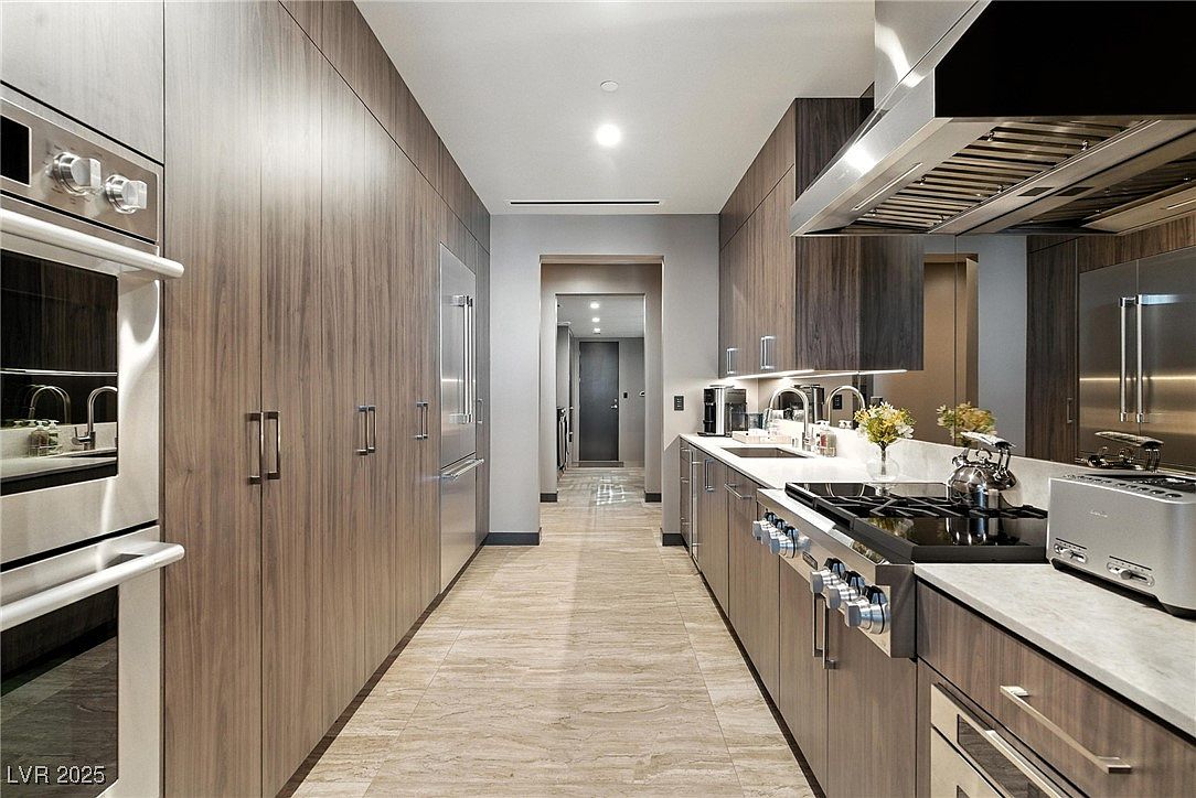 A sleek, contemporary kitchen galley features seamless cabinetry in a warm wood finish that extends to full height, maximizing storage for a clutter-free environment. An efficient layout with dual countertops and integrated appliances ensures that meal preparation is easy for families of all sizes. Neutral-toned stone flooring pairs harmoniously with the natural wood cabinets and stainless steel accents. Under-cabinet lighting, a polished white countertop, and minimalist hardware create a sophisticated yet inviting atmosphere. Multiple ovens, a gas range, double sinks, and a built-in refrigerator highlight the room’s functionality, making it ideal for everyday family meals and larger gatherings.