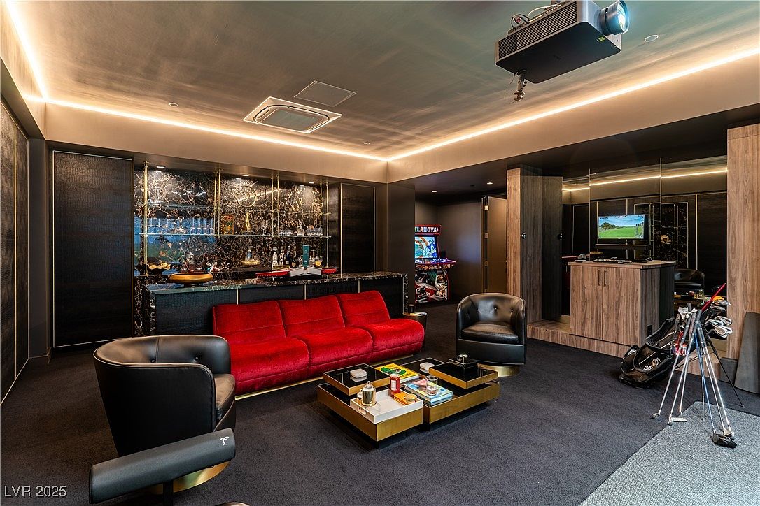 This stunning entertainment lounge showcases a contemporary and inviting design, perfect for gatherings and family fun. A bold red velvet sofa sets a striking focal point, paired with sleek black leather chairs arranged around a stylish central coffee table. The room features mood lighting with recessed LED strips along the ceiling, adding a sophisticated ambiance. A luxurious marble bar area with glass shelving backs up to a wall of shimmering accents, ideal for serving snacks and drinks. In the corner, an arcade machine and a golf simulator cater to all ages, making this space both family-friendly and versatile.