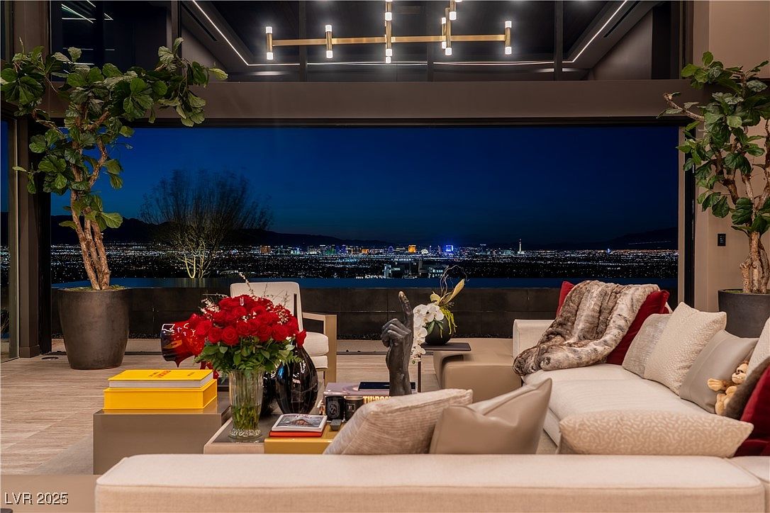 An expansive living room seamlessly transitions to an outdoor terrace through floor-to-ceiling windows, framing a breathtaking cityscape at dusk. Plush cream sofas accented with red and gold pillows provide a cozy yet elegant seating area, ideal for family gatherings or entertaining guests. A contemporary chandelier adds sophistication overhead, while large potted plants infuse the space with natural warmth. Thoughtfully arranged coffee tables hold vibrant flowers, books, and unique décor, enhancing the welcoming, lived-in ambience. Warm neutral tones blend with luxurious textures and subtle pops of color, creating a family-friendly retreat with a vibrant, cosmopolitan backdrop.