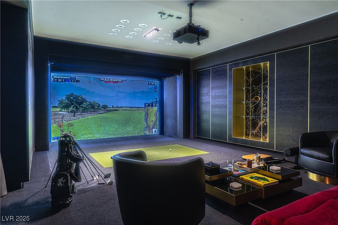 This sophisticated home golf simulator lounge combines cutting-edge entertainment with luxurious comfort. The central feature is a high-quality golfing simulator, set against a crisp, immersive screen and topped with a high-mounted projector. Plush black armchairs create a relaxed, social atmosphere, complemented by a sleek coffee table and a vibrant accent rug. Deep-toned panel walls with golden trim and a backlit display alcove add an upscale, modern aesthetic. The layout is open and uncluttered, making it a comfortable and safe area for families and gatherings. The color palette of dark neutrals and gold exudes both warmth and contemporary elegance.