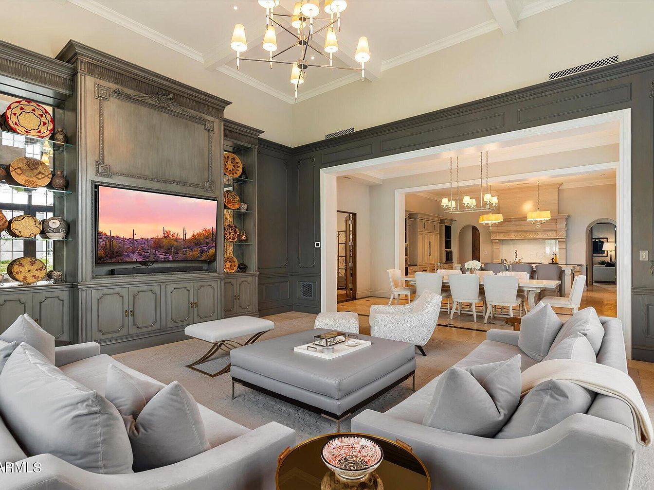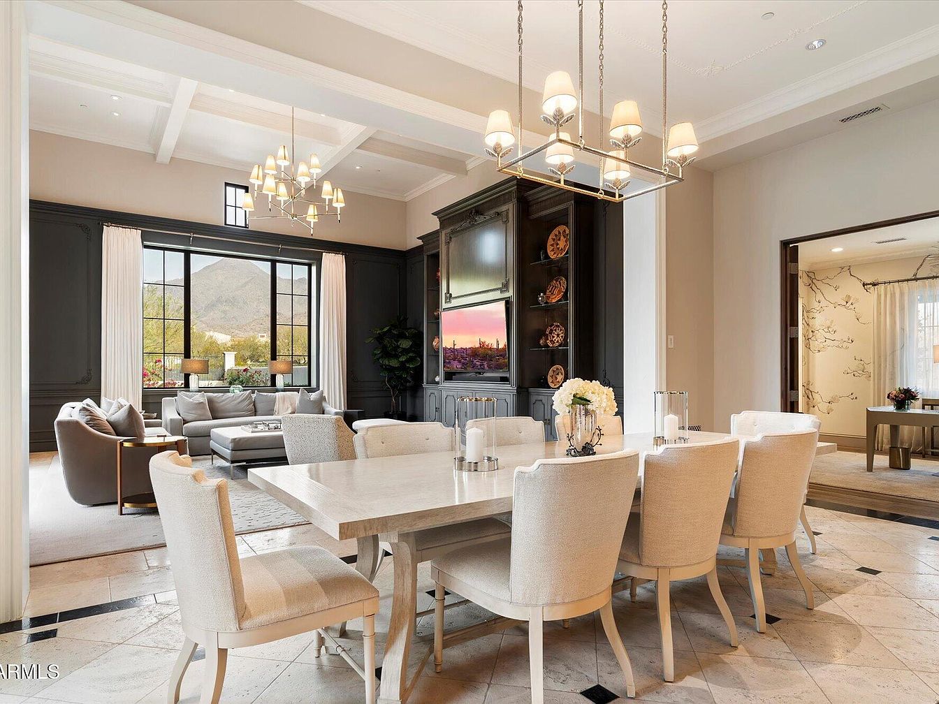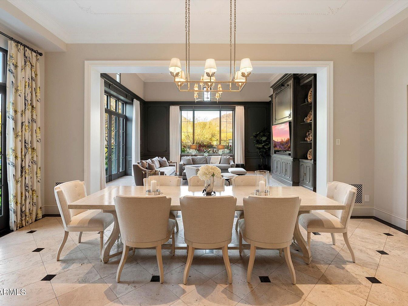Designed for comfort and style, this dining room seamlessly flows into the living area, creating an inviting space for family gatherings. A spacious, light-colored dining table is surrounded by plush upholstered chairs, promoting a warm atmosphere. The stunning views through large windows bring the beauty of nature indoors, framing the serene mountain backdrop. Soft, neutral tones enhance the elegance, while the high ceiling adorned with designer light fixtures adds sophistication. Architectural details, such as crown molding and a cozy fireplace, create a harmonious blend of modern luxury and traditional charm, making it perfect for both entertaining and everyday living.