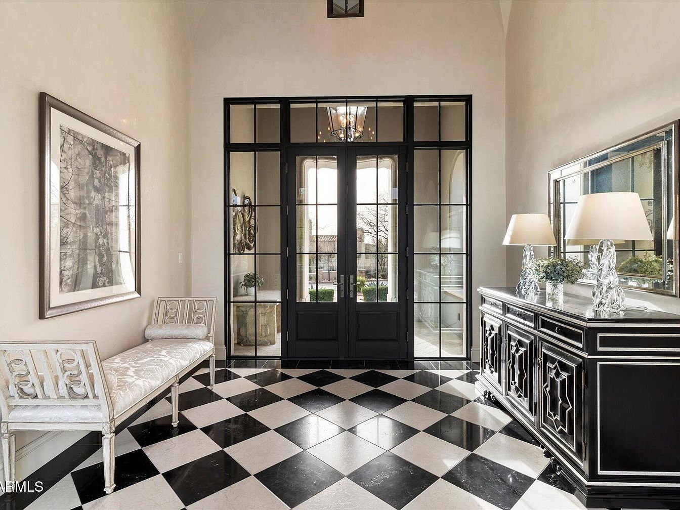 This stunning entryway features a grand black and white checkered floor, creating a striking first impression. Tall ceilings enhance the spacious feel, complemented by large glass doors that usher in natural light and offer a glimpse of the outdoor landscape. The elegant cabinetry showcases intricate detailing, while the minimalist lamps and fresh greenery add a touch of warmth. A serene artwork piece adorns the wall, enhancing the sophisticated atmosphere. Stylish seating invites family and guests to linger, making this entryway not only a beautiful transition into the home but also a welcoming space for gatherings.