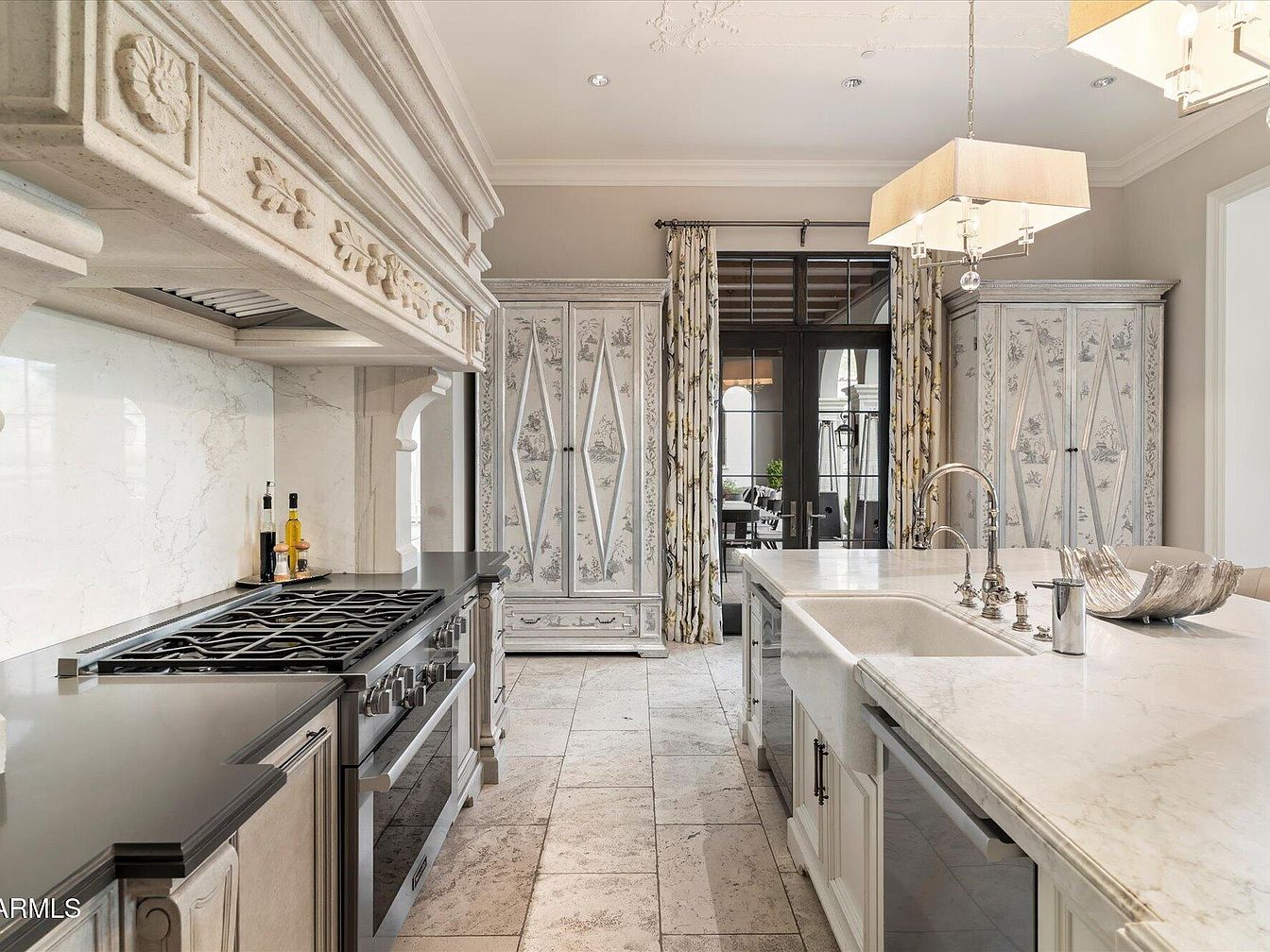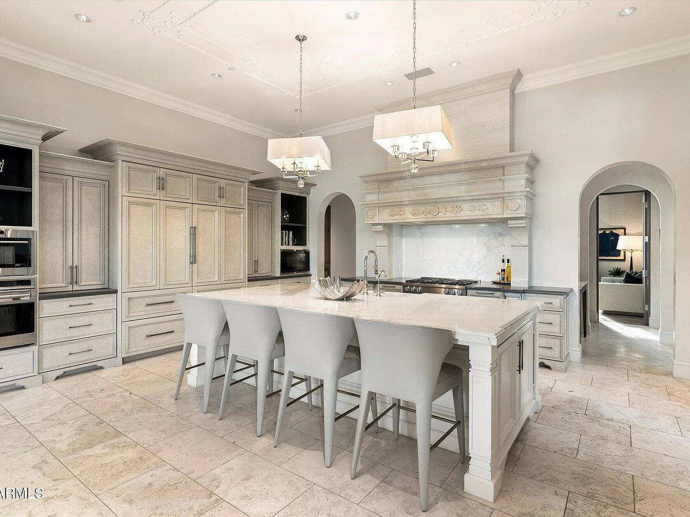 A stunning kitchen featuring a spacious layout perfect for family gatherings and culinary creativity. The light gray cabinetry complements the creamy marble countertops, harmonizing with the stone flooring’s soft hues. An elegant central island invites casual dining, complete with modern bar stools, while sophisticated pendant lighting enhances the aesthetic. Architectural details, such as the ornate hood above the stove and the intricate ceiling design, add refinement. The open concept seamlessly transitions to adjacent spaces, allowing natural light to flow through. Ample storage and contemporary appliances ensure functionality, making this kitchen a stylish and practical heart of the home.