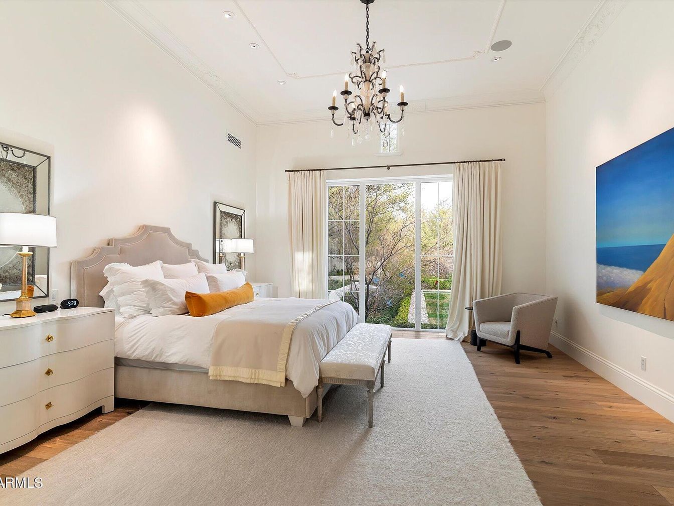 This master bedroom embodies tranquility with its spacious layout and elegant design elements. A plush king-sized bed is adorned with abundant pillows, featuring a warm orange accent cushion that adds a pop of color. The soft, neutral color scheme creates a calming atmosphere, complemented by the rich texture of the hardwood flooring. Large glass doors invite natural light and offer access to a serene outdoor view, framed by delicate, flowing curtains. A stylish chandelier overhead adds a touch of sophistication, while contemporary artwork adorns the wall, enhancing the room’s inviting ambiance, perfect for relaxation and family gatherings.