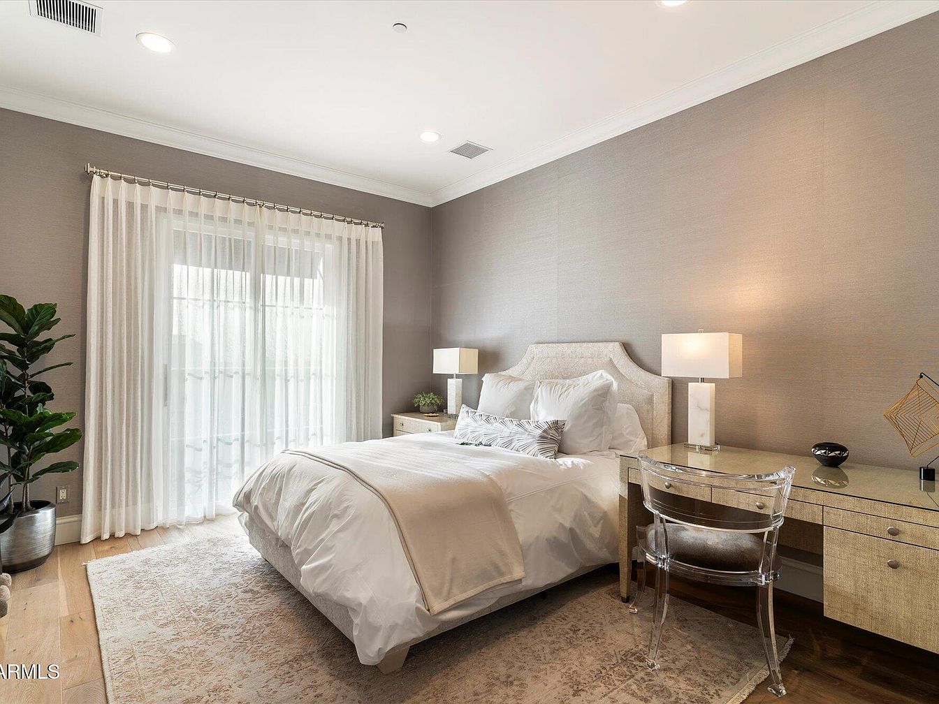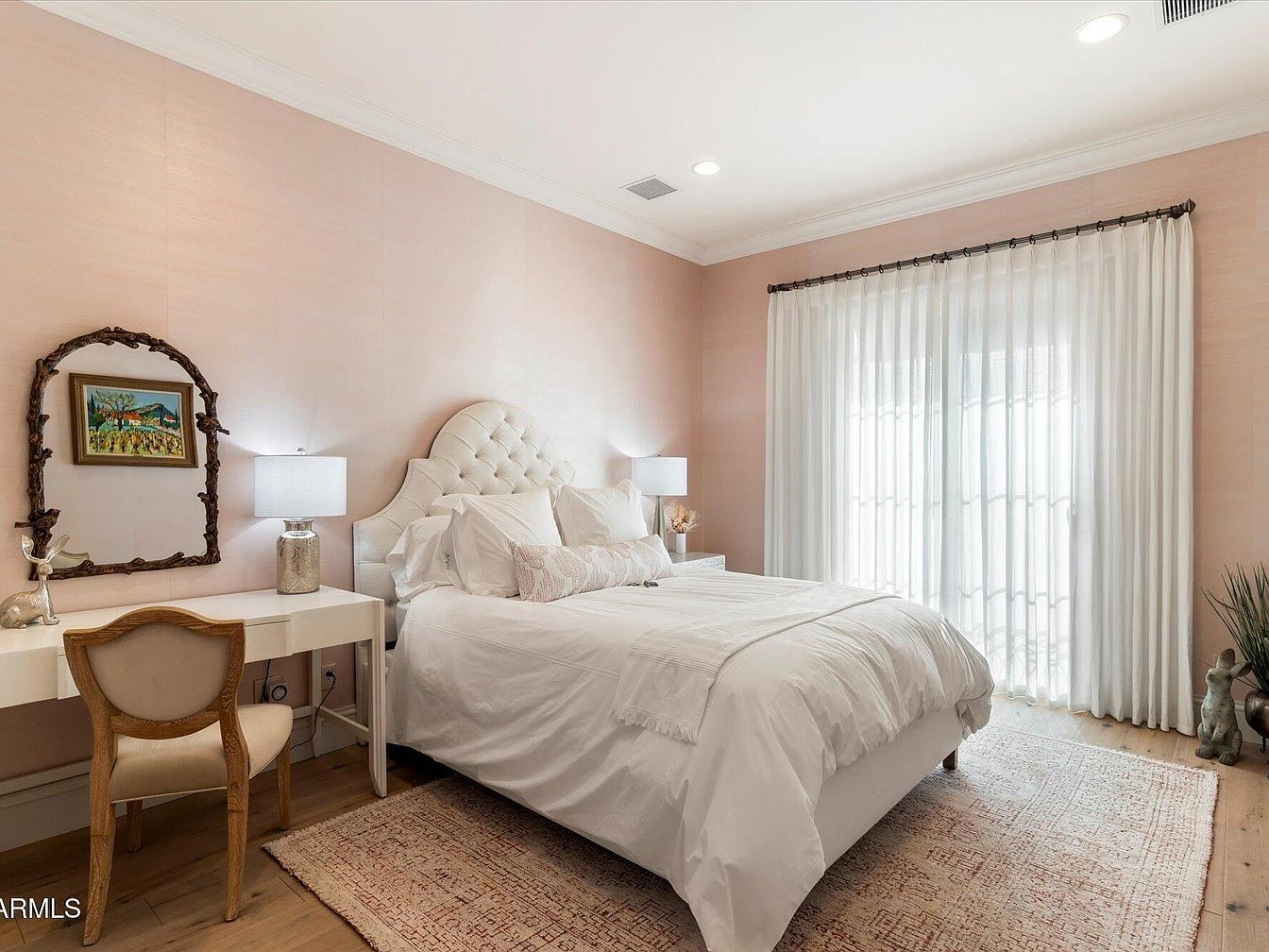 This serene master bedroom showcases a sophisticated blend of comfort and elegance. Soft pink wallpaper creates a warm ambiance, complemented by a plush, tufted headboard and crisp white bedding. A sleek white nightstand is paired with stylish lamps, adding both function and flair. The space features a practical, chic writing desk with an elegant chair, perfect for quiet reflection. Natural light floods in through sheer curtains, enhancing the inviting atmosphere. Textured rugs add warmth underfoot, while tasteful artwork and decorative accents personalize the space, creating a tranquil retreat for relaxation and rejuvenation.