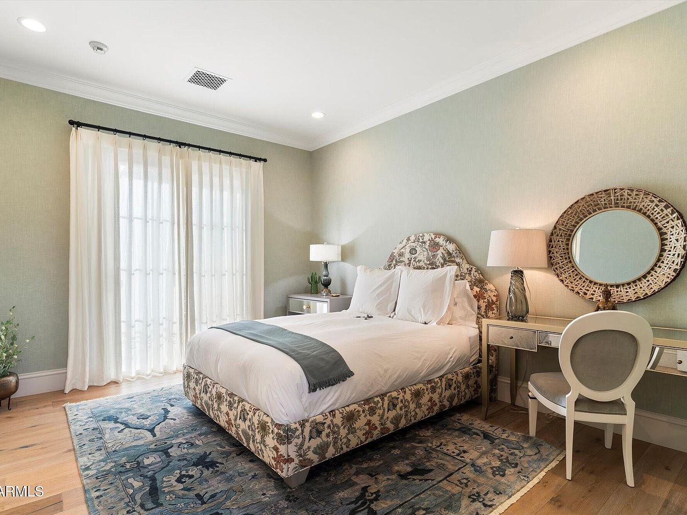 This serene master bedroom blends elegance and comfort, featuring a spacious layout that invites relaxation. The soft green walls create a tranquil atmosphere, complemented by natural light pouring in through sheer curtains. A beautifully upholstered bed with a floral headboard serves as the focal point, while a plush area rug adds warmth underfoot. A sleek, mirrored vanity and a chic white chair provide a stylish workspace. Minimalist lighting enhances the soothing ambiance, and subtle décor elements, like potted plants, introduce a touch of freshness. This thoughtfully designed space offers a perfect blend of functionality and aesthetic appeal, ideal for any homeowner.