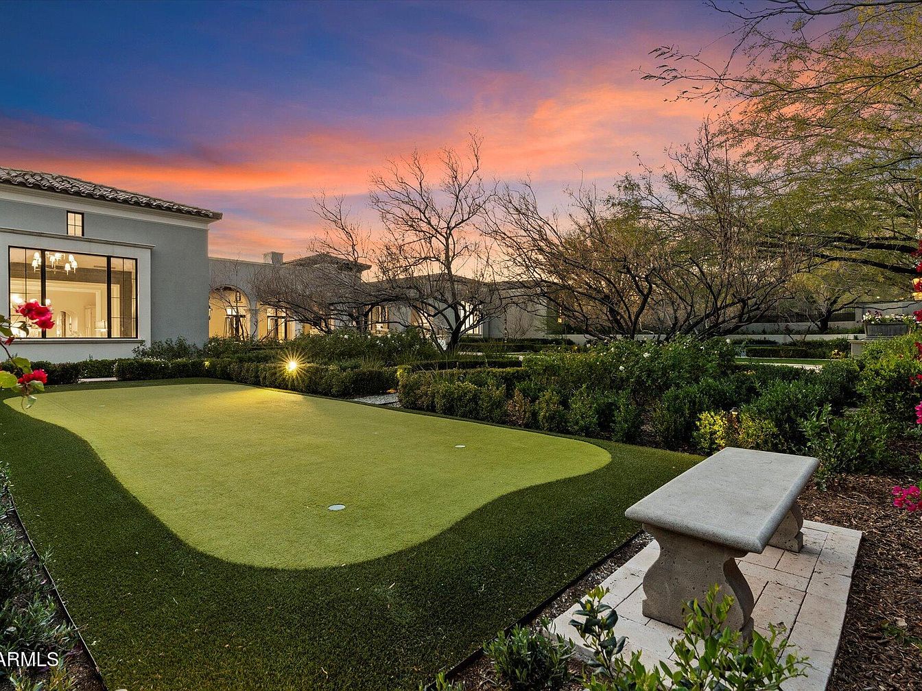 This stunning backyard features a well-maintained putting green surrounded by lush greenery, making it perfect for family gatherings and leisure activities. A light-colored stone bench invites relaxation, allowing for serene outdoor moments. The meticulously landscaped garden adds a vibrant touch, showcasing colorful flowers in harmony with elegant shrubbery. A backdrop of soft, warm sunset hues fills the sky, enhancing the tranquil ambiance. Architectural details like large windows frame views of the interior, creating a seamless connection with nature. This outdoor space is designed for both recreation and relaxation, epitomizing a welcoming family-friendly environment.