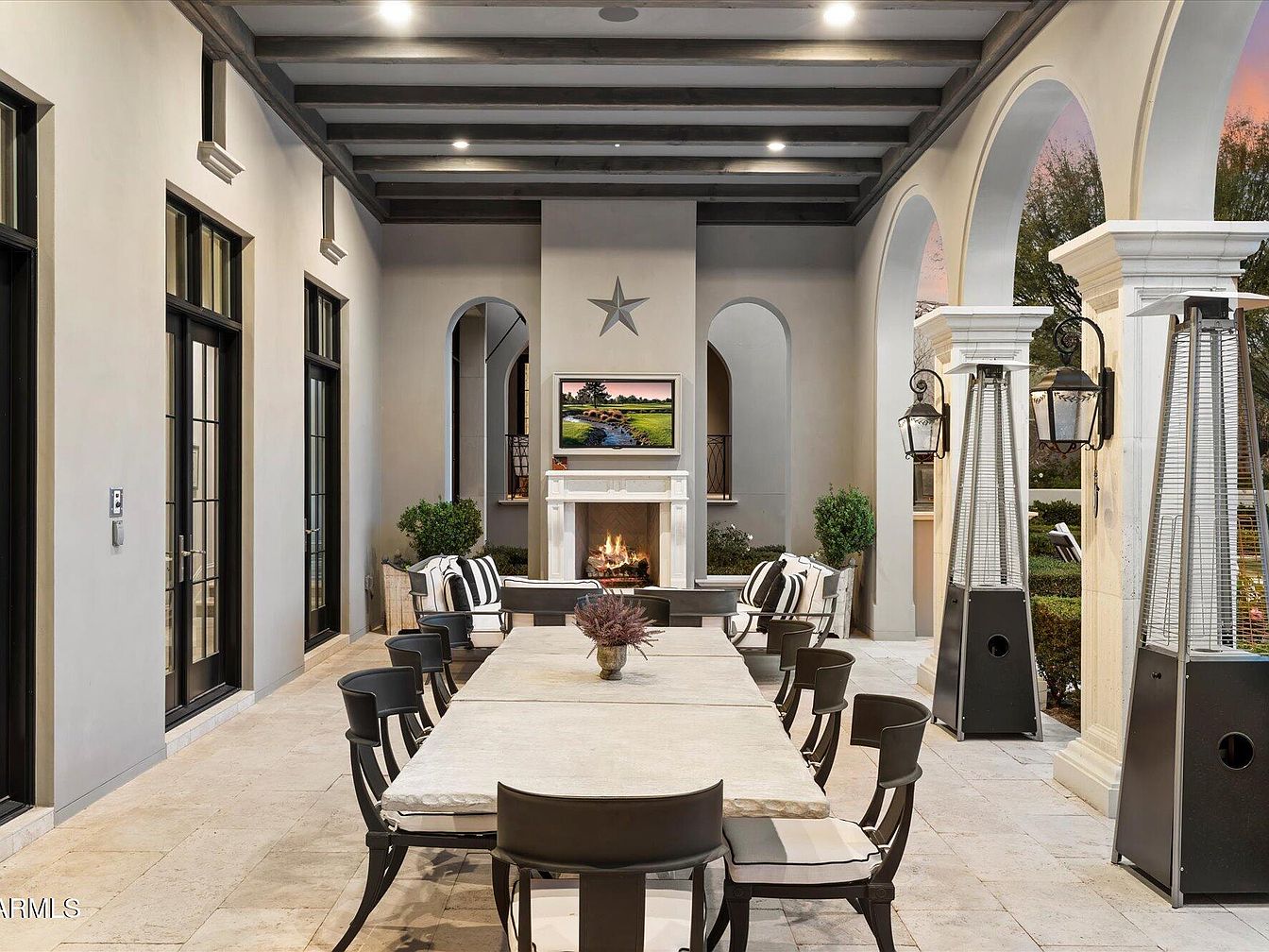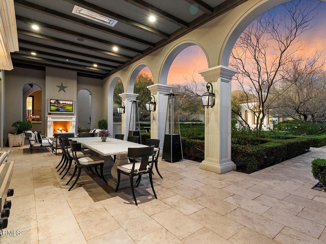 Experience the elegance of this stunning patio dining area, seamlessly blending indoor comfort with outdoor charm. The spacious table invites gatherings, surrounded by chic black chairs with plush cushions. Architectural arches frame the space, accentuated by soft ambient lighting from lanterns, creating a cozy atmosphere. A built-in fireplace offers warmth, while a mounted TV enhances entertainment options. Natural stone flooring complements the neutral color scheme, harmonizing with meticulously manicured gardens visible through the arches. Ideal for family meals or entertaining guests, this area encapsulates the essence of modern outdoor living, making it the perfect retreat.