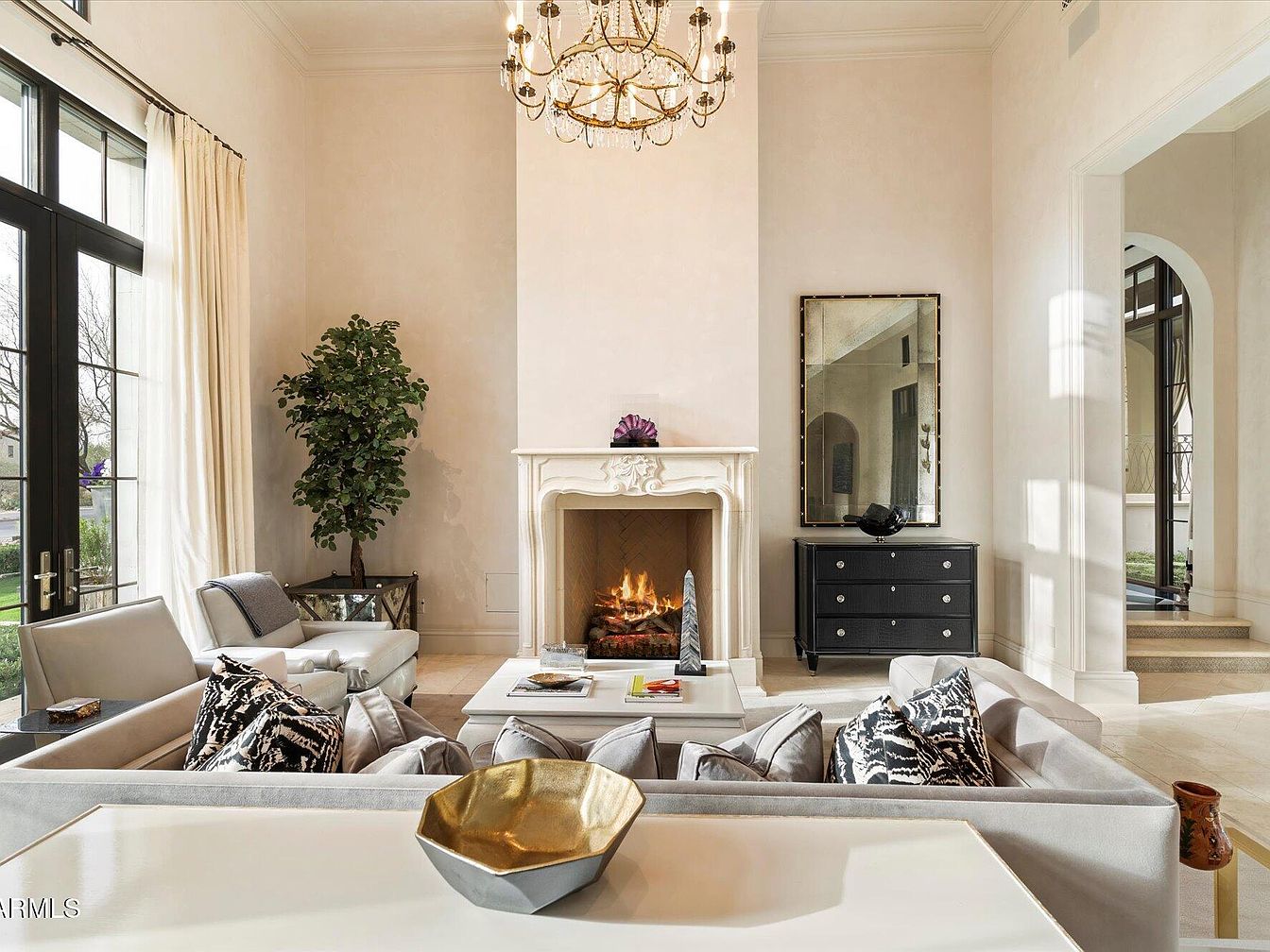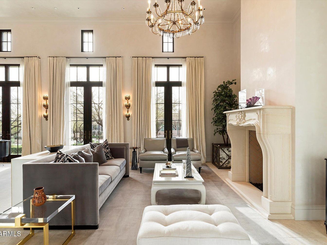 This spacious living room exudes sophistication and warmth, featuring an open layout with high ceilings and abundant natural light. Plush sofas in gray and soft neutrals invite relaxation, complemented by a chic coffee table with a glass top and gold accents. Elegant drapes frame large windows, enhancing the welcoming ambiance while providing views of the outdoors. A stunning chandelier hangs overhead, casting a gentle glow across the room, and an intricately designed fireplace adds charm to the space. Family-friendly elements, like ample seating and a cozy atmosphere, make it perfect for gatherings or quiet evenings.