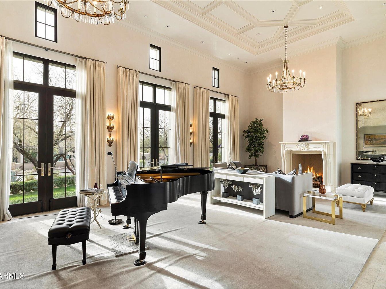This elegant living room showcases a harmonious blend of luxury and comfort. Features include high ceilings adorned with intricate moldings, complemented by large, charcoal-framed windows that flood the space with natural light. A grand black piano sits prominently, inviting musical gatherings. The stylish gray sofa pairs beautifully with chic gold accents and a cozy, tufted white ottoman. A classic fireplace, finished in ornate white stone, serves as a centerpiece, radiating warmth. Soft, neutral tones throughout, including plush carpeting and flowing drapes, create a serene atmosphere, perfect for family gatherings or intimate evenings.
