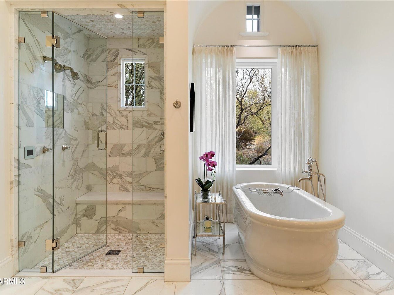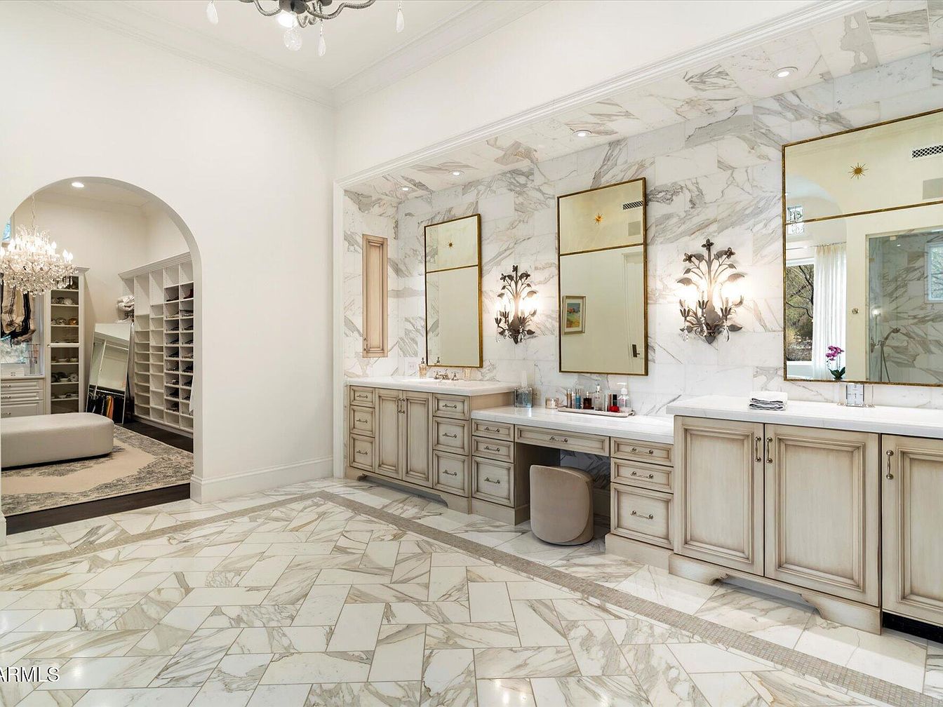 This luxurious master bathroom features a spacious layout adorned with exquisite marble flooring, creating a serene atmosphere. The design is enhanced by the soft color palette of whites and creams, complemented by elegant cabinetry and three stunning mirrors that reflect natural light. Decorative wall sconces add a touch of sophistication, while the chandelier above brings opulence. An adjoining area showcases a well-organized closet, accessible through an inviting arched entryway, enhancing the room’s functionality. The blend of style and comfort makes this bathroom perfect for relaxation, with thoughtful family-friendly features ensuring practicality without compromising aesthetics.