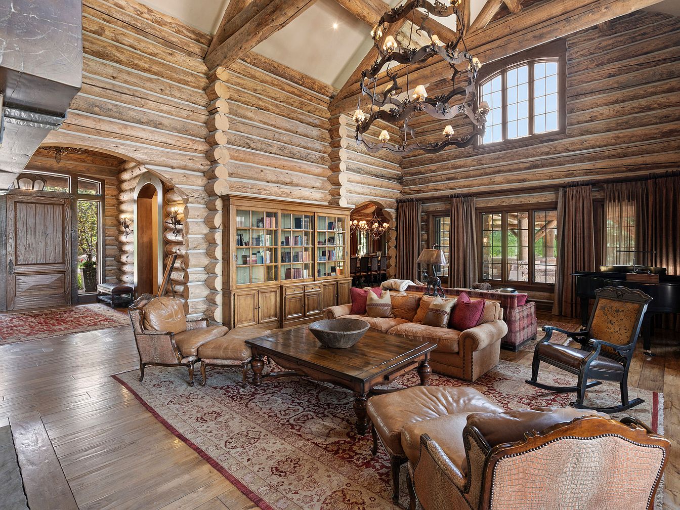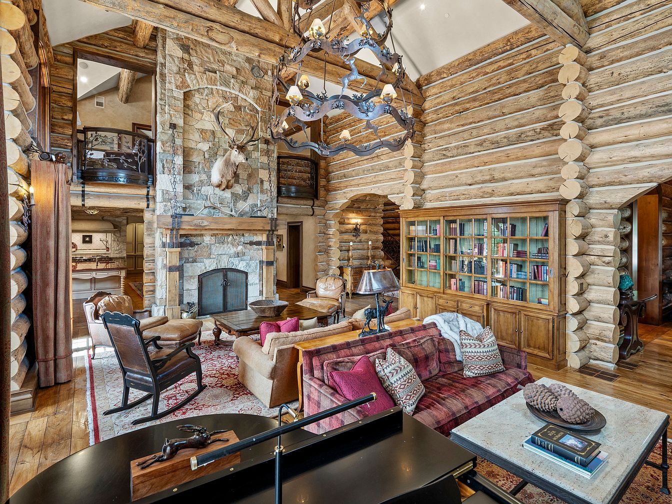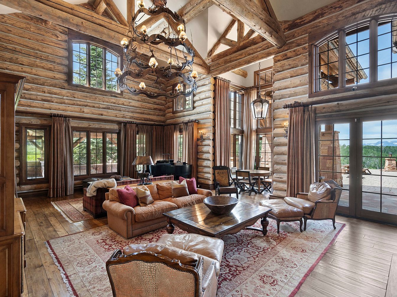 This spacious great room showcases a stunning blend of rustic charm and modern elegance, highlighted by soaring wooden beams and warm log walls. The inviting layout offers ample seating with a sprawling leather couch adorned with plush pillows, perfect for family gatherings. Large windows framed with rich curtains flood the space with natural light, providing breathtaking views of the outdoors. A handcrafted wooden coffee table sits atop an ornate area rug, enhancing the cozy atmosphere. The room features sophisticated light fixtures and a grand piano, making it ideal for both relaxation and entertainment.