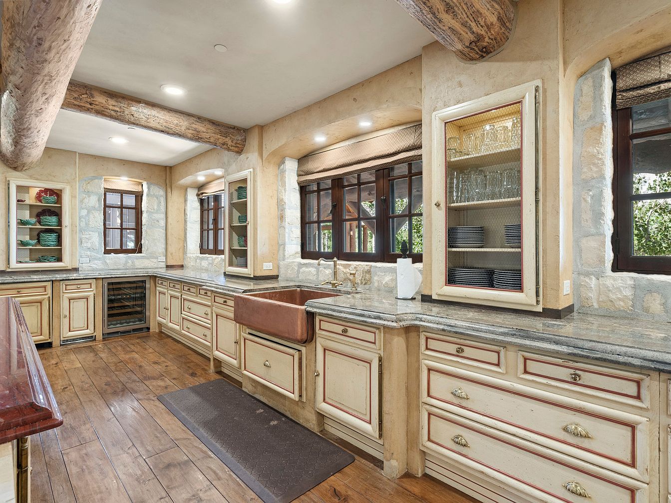 This spacious kitchen blends rustic charm with contemporary comfort, highlighted by exposed wooden beams and a warm color palette. The intricate cabinetry, featuring a distressed finish and elegant hardware, adds character. A striking farmhouse sink rests beneath charming windows, offering natural light along with scenic views. The granite countertops reflect a lovely sheen, perfect for meal preparation. A built-in wine cooler enhances the functionality, while ample storage options ensure a clutter-free space. Rich wooden flooring complements the overall design, creating a welcoming atmosphere ideal for family gatherings and culinary adventures.