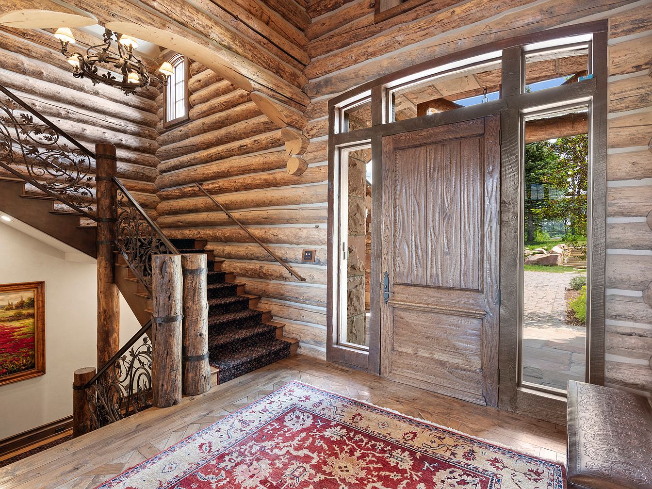 This stunning lodge-style entryway features warm log walls showcasing rustic charm and natural beauty. A grand wooden door opens to reveal a welcoming atmosphere enhanced by a wrought-iron staircase, offering both elegance and safety for families. The plush dark carpet lining the stairs adds comfort, while the intricately designed chandelier overhead casts a warm glow. A tasteful area rug underfoot complements the rich textures of the wood, tying the space together. Large windows illuminate the room with natural light, inviting the outdoors in and setting the tone for a serene home experience, perfect for family gatherings.