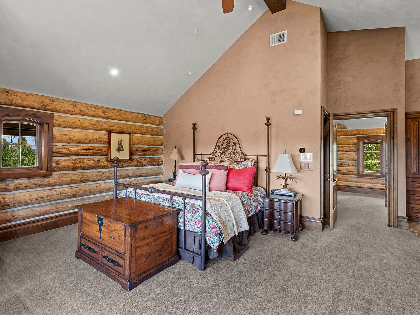 This master bedroom boasts a striking blend of rustic charm and modern comfort, characterized by warm log walls and a cozy, sloped ceiling. The room features a beautiful iron bed adorned with vibrant floral bedding and plush throw pillows, creating an inviting atmosphere. A vintage wooden chest at the foot of the bed adds functional elegance, serving as both storage and a statement piece. Natural light filters through the charming window, illuminating the earthy color palette of soft browns and creams. Elegant wooden trim and a subtle ceiling fan enhance the comfort, making it a perfect family-friendly retreat.
